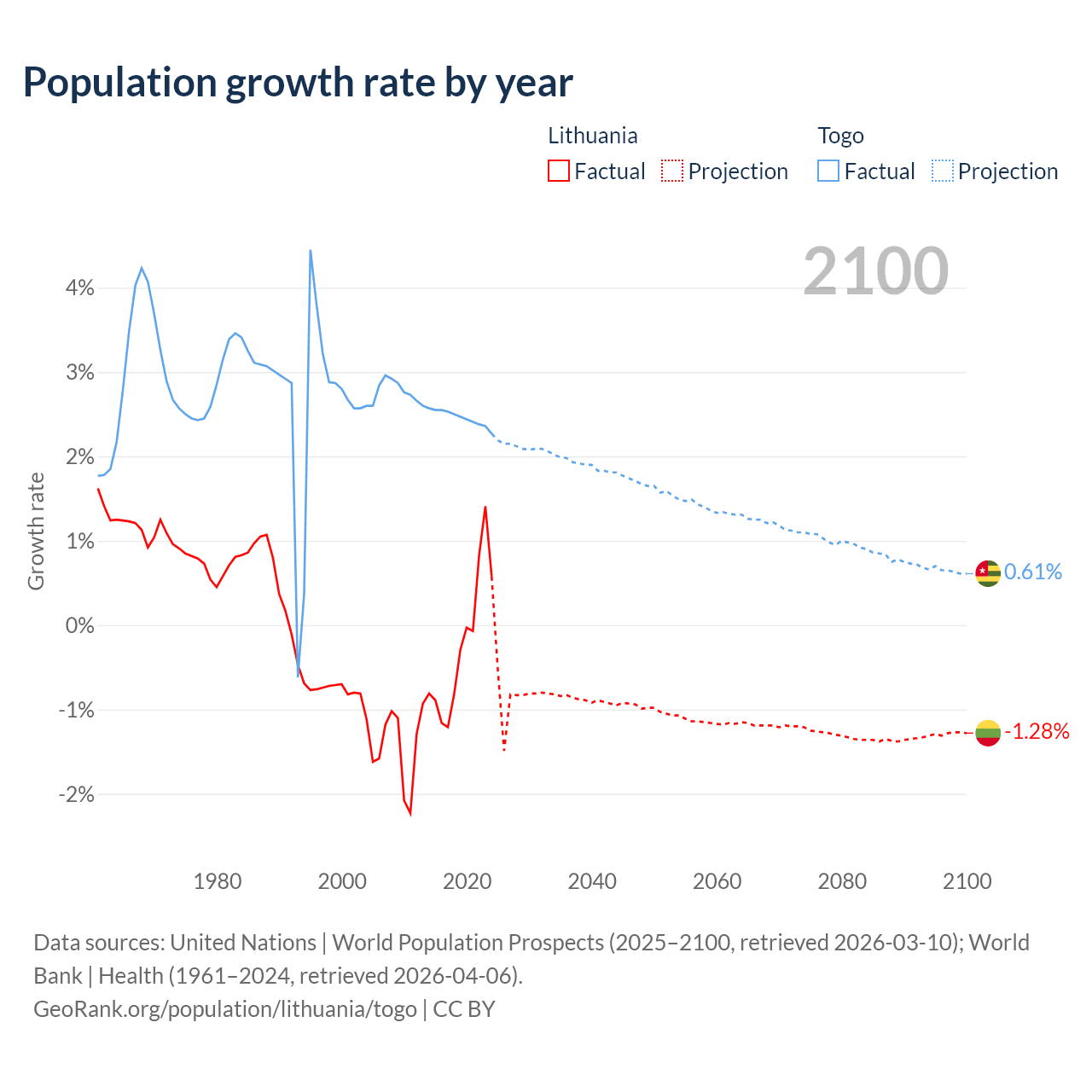 - For the last 10 years, Lithuania has had an average growth rate of -0.22% per year vs +2.46% in Togo.
