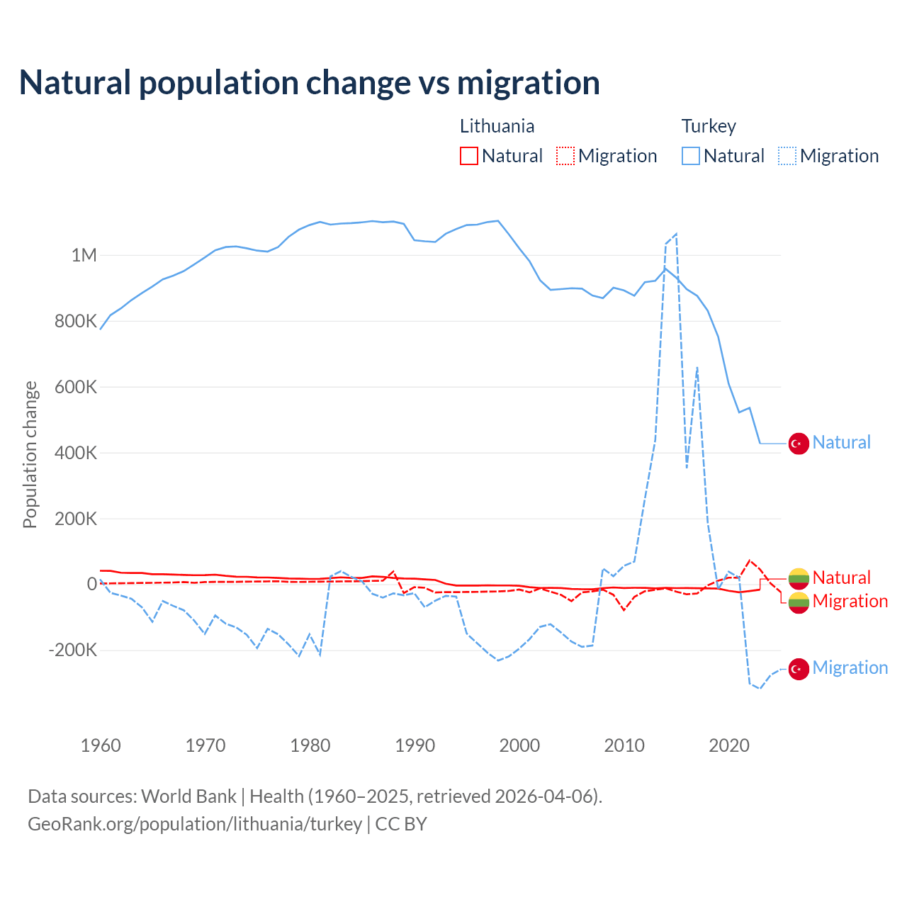 Over the last 10 years, 68.7% of the population change in Lithuania is from natural causes (a loss of 153,859 people) and 31.3% is from migration (a gain of 70,196 people). In Turkey 73% is from natural causes (a gain of 7,333,352 people) and 27% is from migration (a gain of 2,718,916 people).