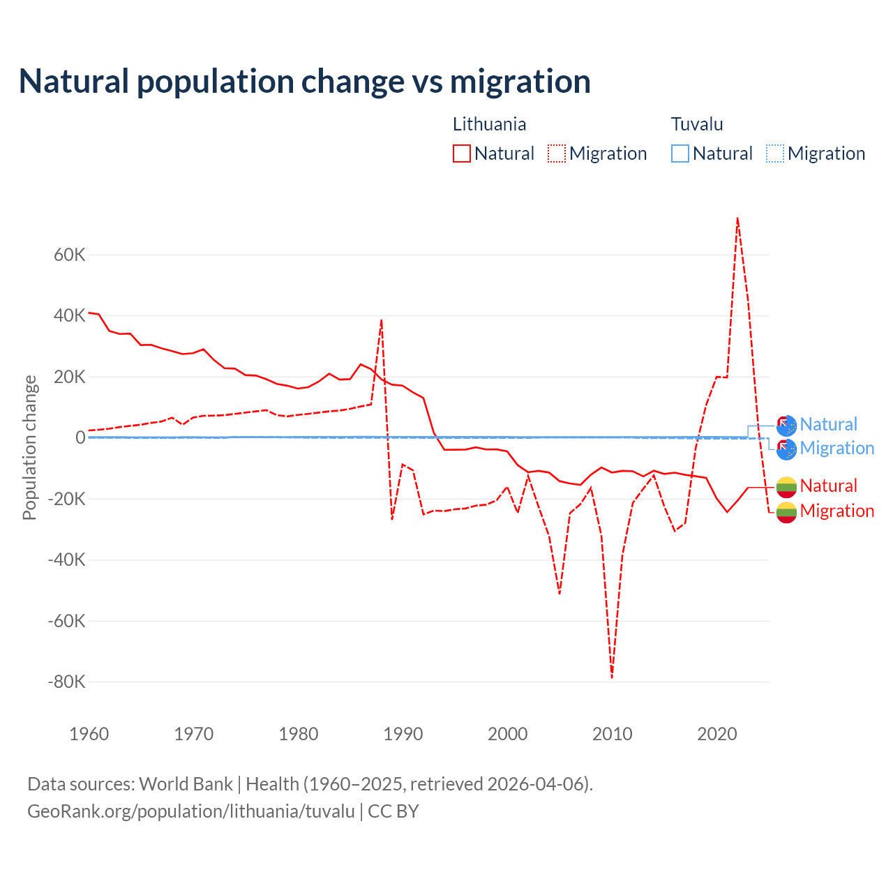 Over the last 10 years, 68.7% of the population change in Lithuania is from natural causes (a loss of 153,859 people) and 31.3% is from migration (a gain of 70,196 people). In Tuvalu 35.5% is from natural causes (a gain of 1,556 people) and 64.5% is from migration (a loss of 2,827 people).