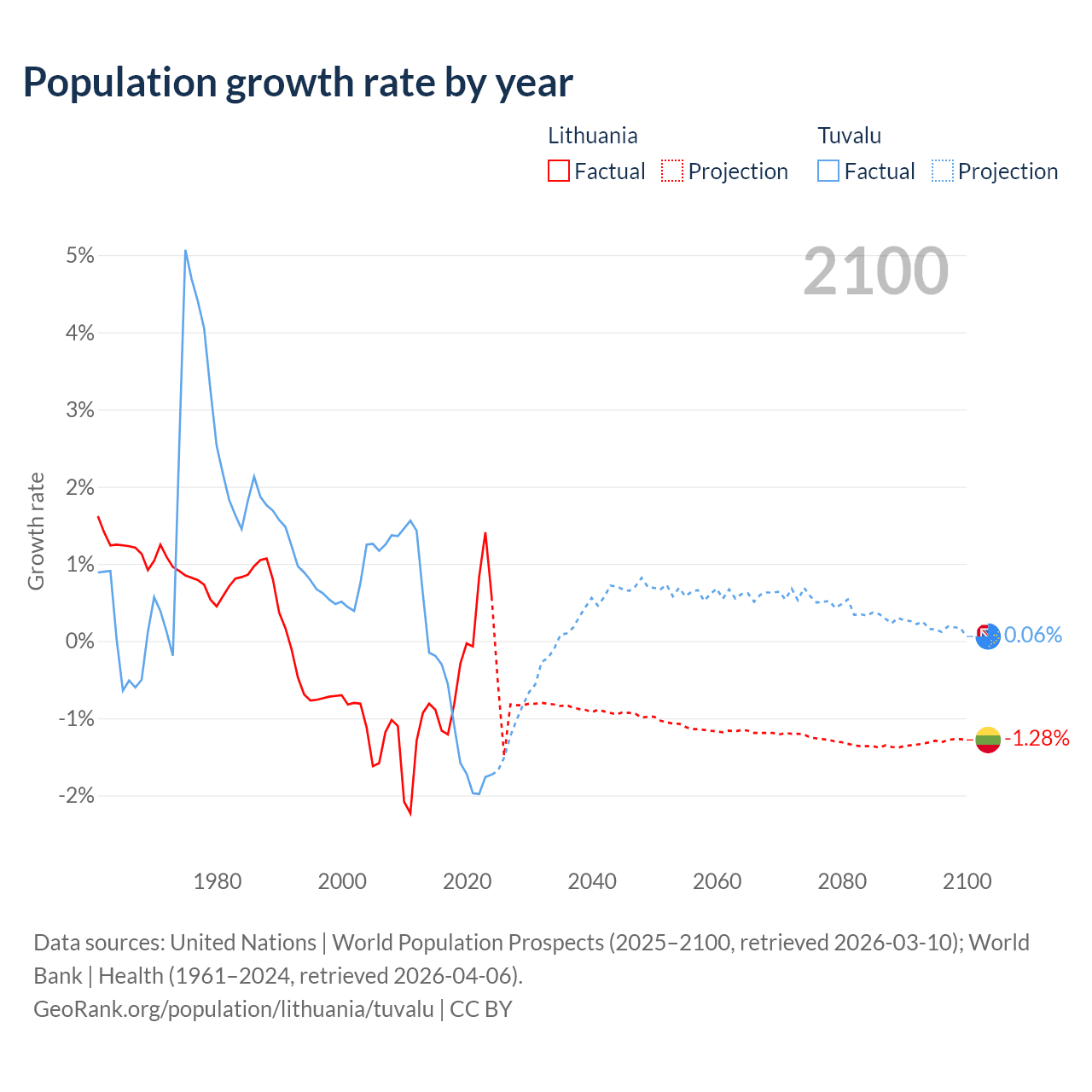 - For the last 10 years, Lithuania has had an average growth rate of -0.22% per year vs -1.19% in Tuvalu.