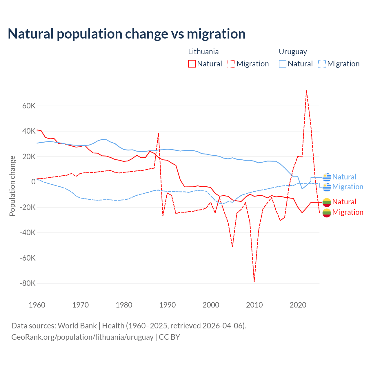 Over the last 10 years, 68.7% of the population change in Lithuania is from natural causes (a loss of 153,859 people) and 31.3% is from migration (a gain of 70,196 people). In Uruguay 70% is from natural causes (a gain of 64,303 people) and 30% is from migration (a loss of 27,501 people).