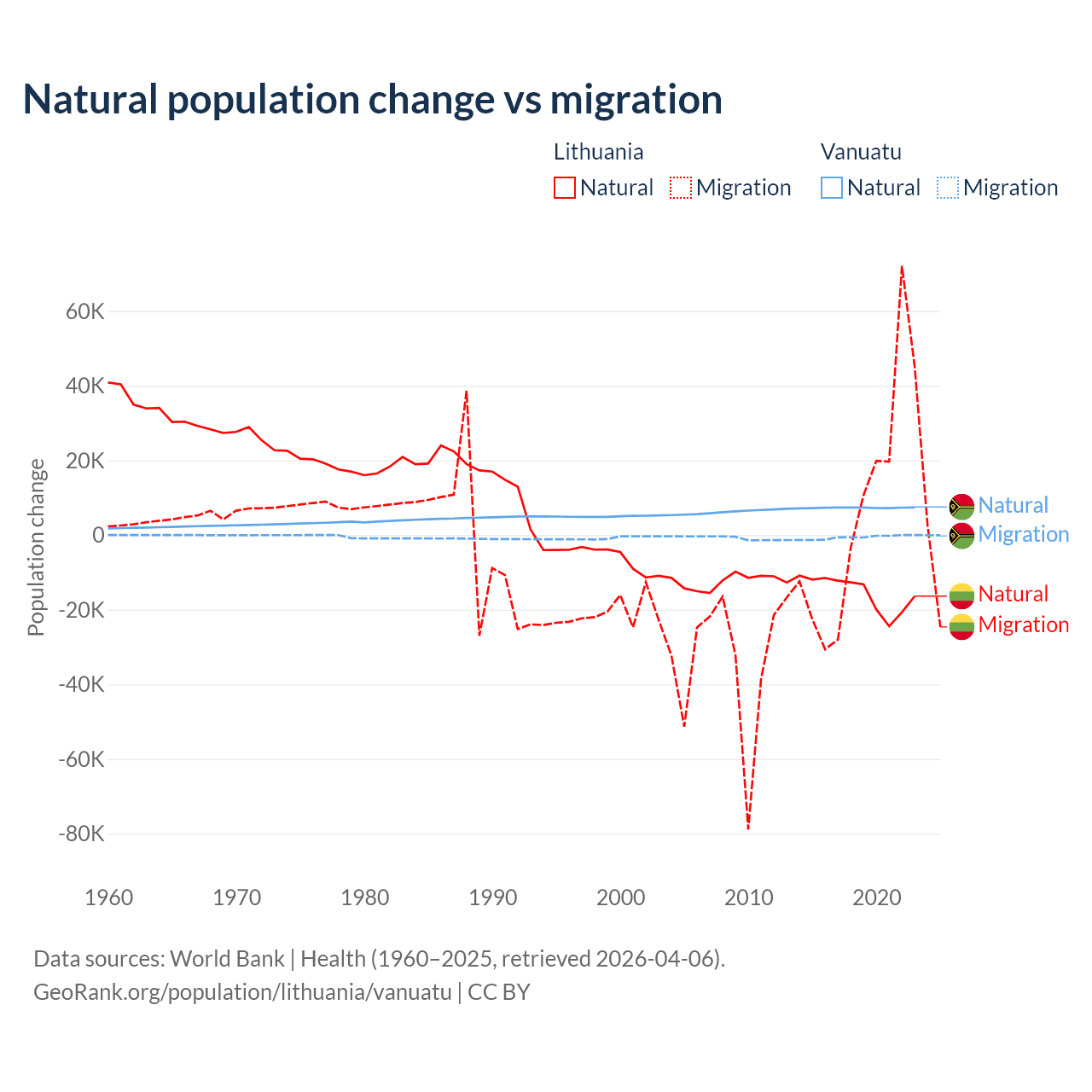 Over the last 10 years, 68.7% of the population change in Lithuania is from natural causes (a loss of 153,859 people) and 31.3% is from migration (a gain of 70,196 people). In Vanuatu 92.2% is from natural causes (a gain of 72,941 people) and 7.81% is from migration (a loss of 6,181 people).