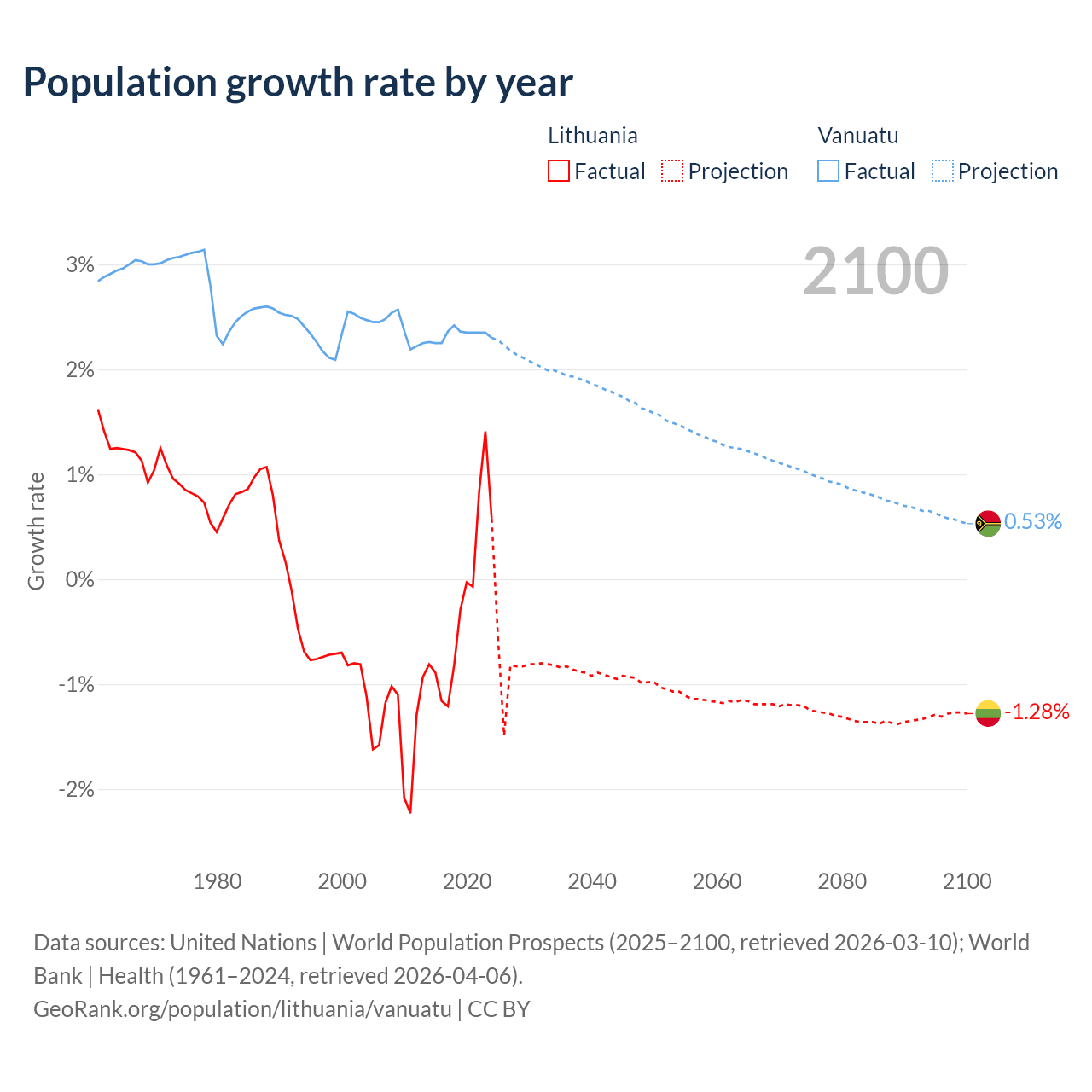 - For the last 10 years, Lithuania has had an average growth rate of -0.22% per year vs +2.33% in Vanuatu.