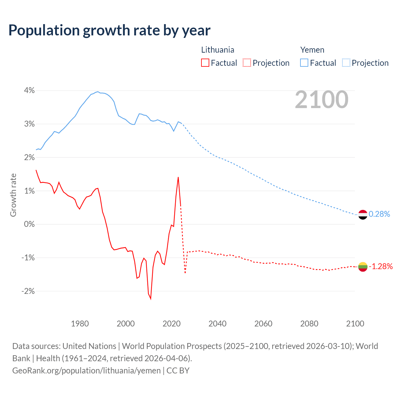 - For the last 10 years, Lithuania has had an average growth rate of -0.22% per year vs +3% in Yemen.