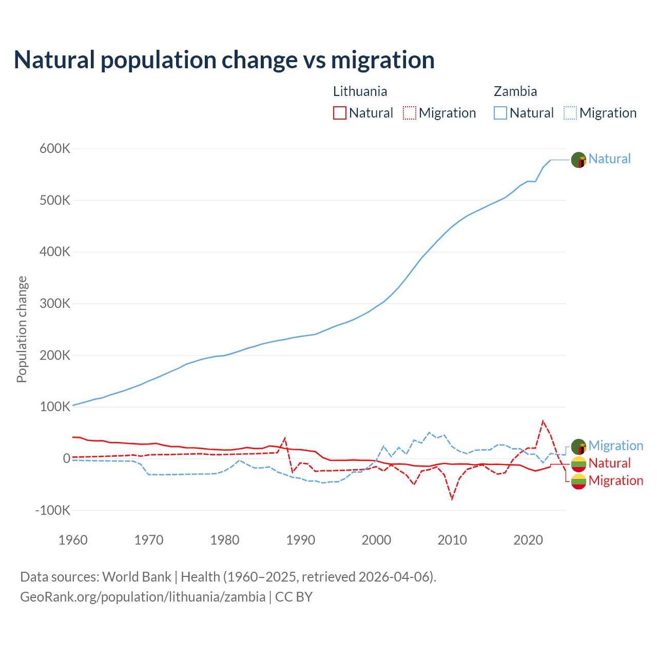 Over the last 10 years, 68.7% of the population change in Lithuania is from natural causes (a loss of 153,859 people) and 31.3% is from migration (a gain of 70,196 people). In Zambia 97.4% is from natural causes (a gain of 5,233,797 people) and 2.58% is from migration (a gain of 138,554 people).