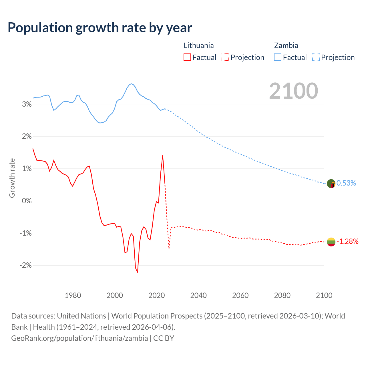 - For the last 10 years, Lithuania has had an average growth rate of -0.22% per year vs +3% in Zambia.