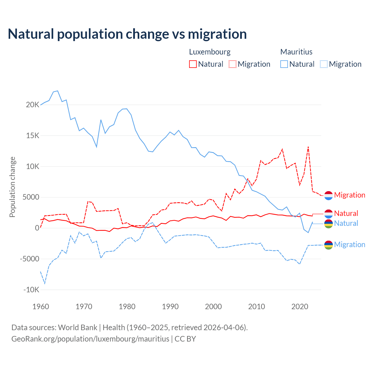 Over the last 10 years, 16.8% of the population change in Luxembourg is from natural causes (a gain of 20,287 people) and 83.2% is from migration (a gain of 100,435 people). In Mauritius 30.9% is from natural causes (a gain of 19,327 people) and 69.1% is from migration (a loss of 43,294 people).