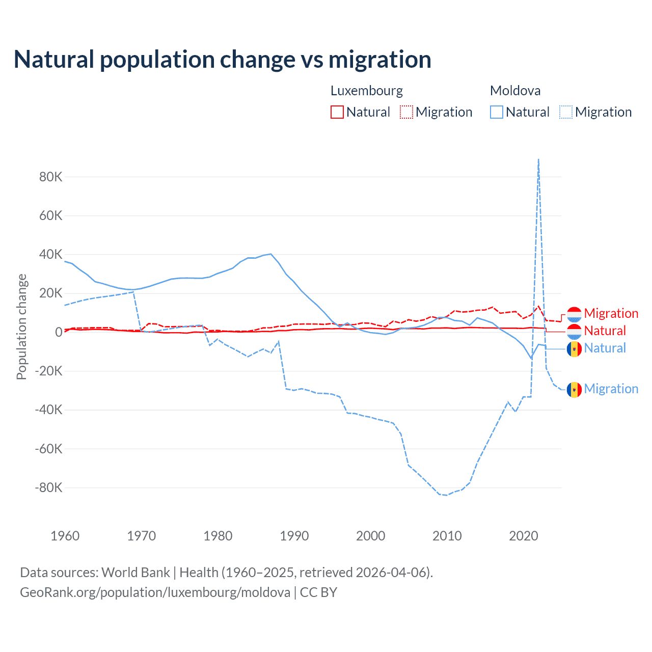 Over the last 10 years, 16.8% of the population change in Luxembourg is from natural causes (a gain of 20,287 people) and 83.2% is from migration (a gain of 100,435 people). In Moldova 6.04% is from natural causes (a loss of 19,001 people) and 94% is from migration (a loss of 295,631 people).