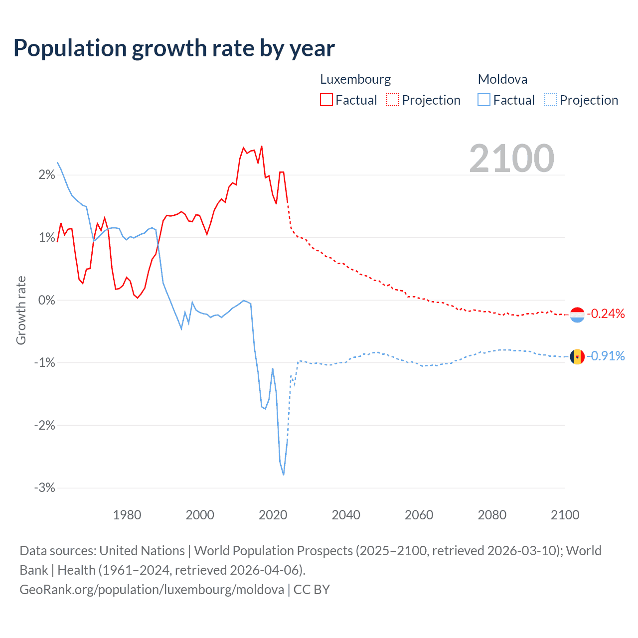 - For the last 10 years, Luxembourg has had an average growth rate of +2.02% per year vs -1.57% in Moldova.