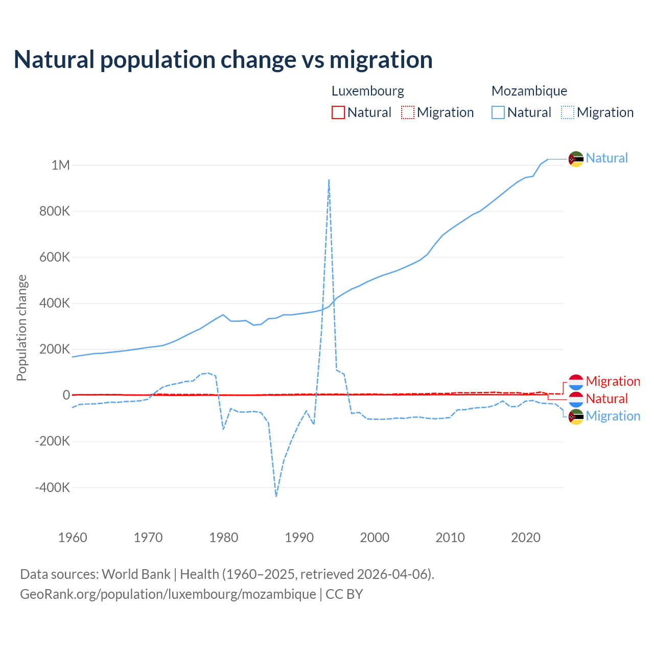Over the last 10 years, 16.8% of the population change in Luxembourg is from natural causes (a gain of 20,287 people) and 83.2% is from migration (a gain of 100,435 people). In Mozambique 95.9% is from natural causes (a gain of 9,108,203 people) and 4.15% is from migration (a loss of 393,923 people).