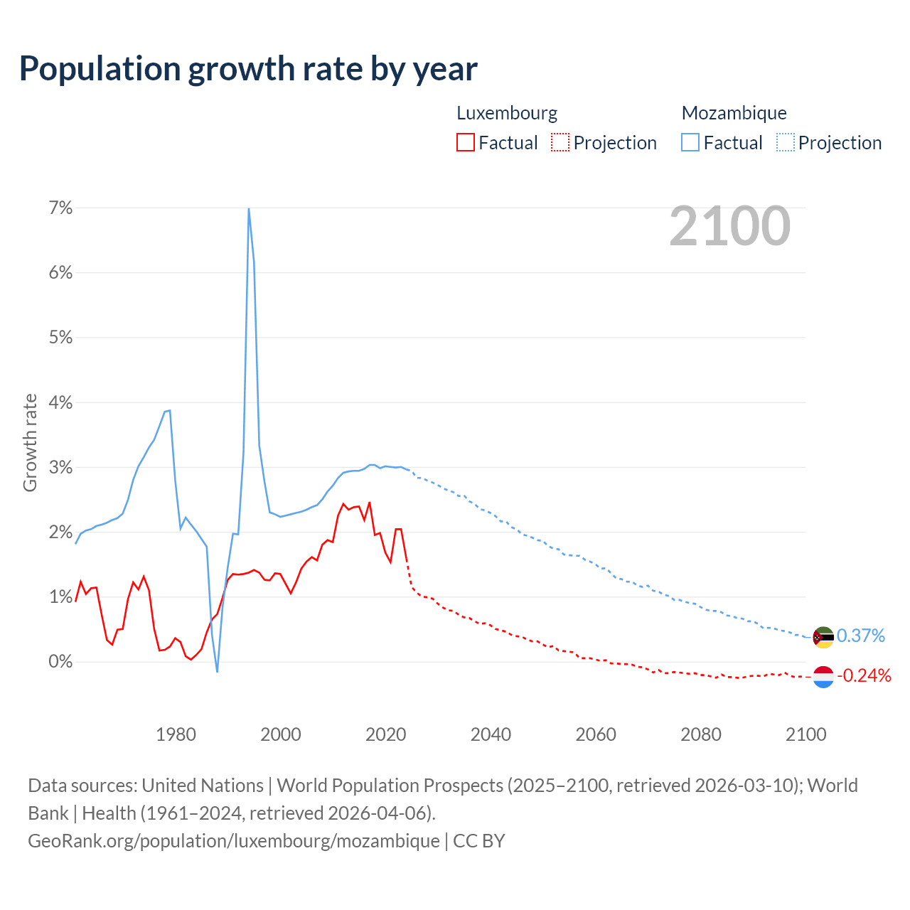 - For the last 10 years, Luxembourg has had an average growth rate of +2.02% per year vs +2.99% in Mozambique.