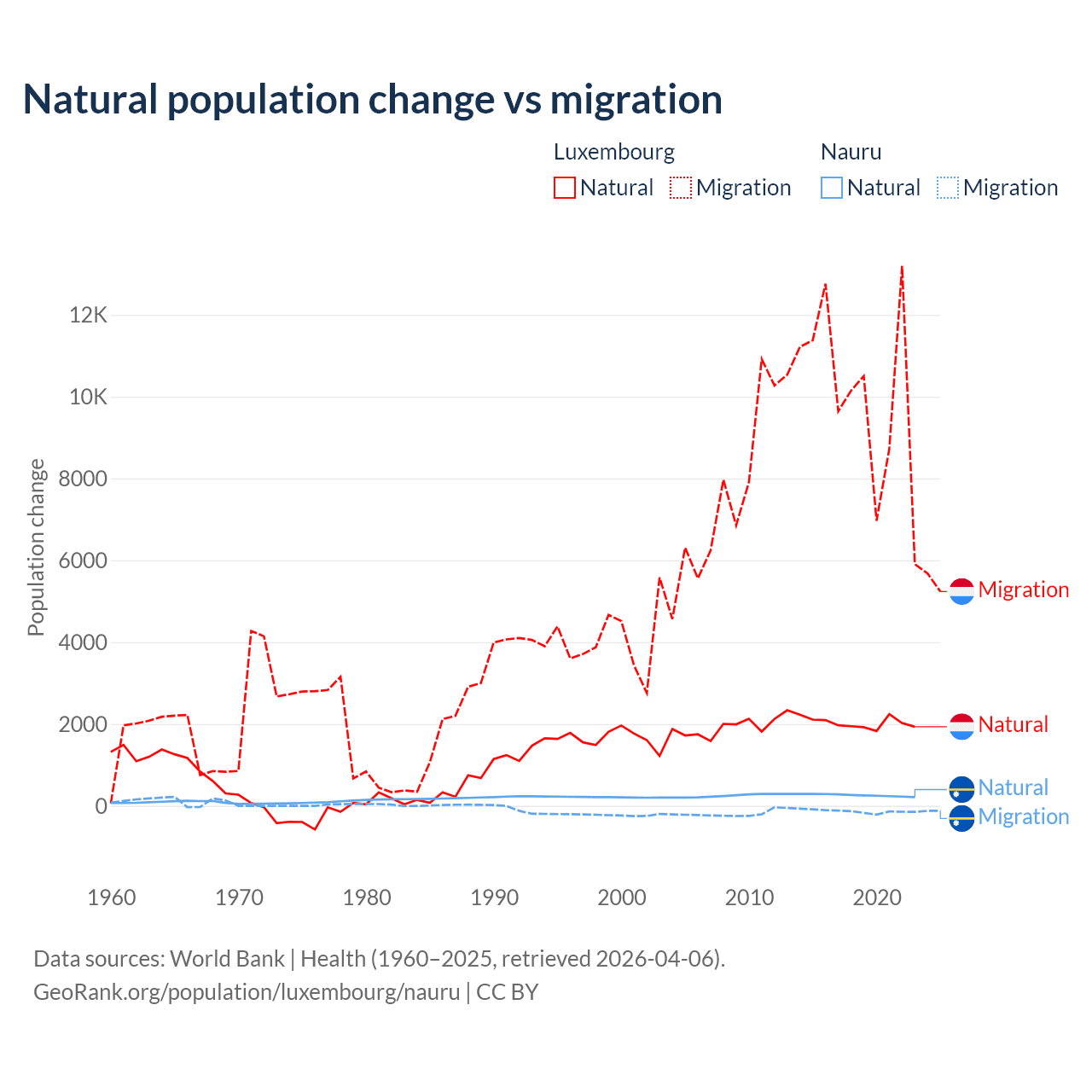 Over the last 10 years, 16.8% of the population change in Luxembourg is from natural causes (a gain of 20,287 people) and 83.2% is from migration (a gain of 100,435 people). In Nauru 66.2% is from natural causes (a gain of 2,590 people) and 33.8% is from migration (a loss of 1,320 people).