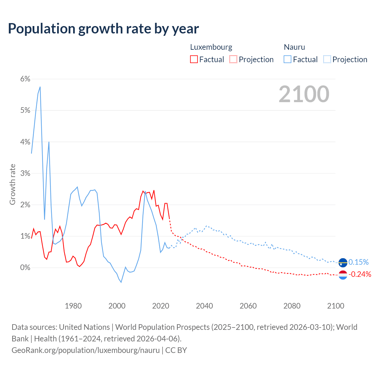 - For the last 10 years, Luxembourg has had an average growth rate of +2.02% per year vs +1.17% in Nauru.