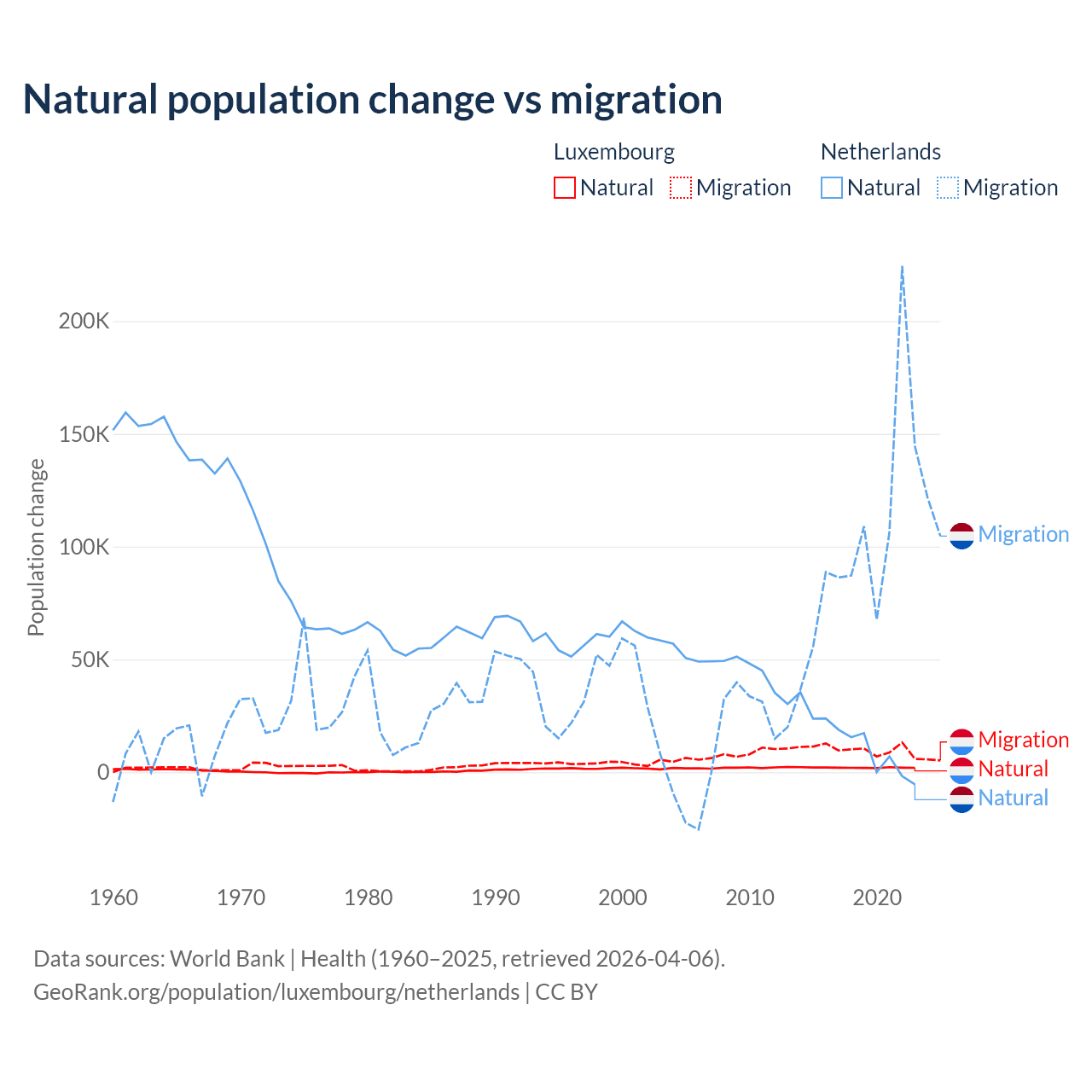 Over the last 10 years, 16.8% of the population change in Luxembourg is from natural causes (a gain of 20,287 people) and 83.2% is from migration (a gain of 100,435 people). In the Netherlands 11.8% is from natural causes (a gain of 134,554 people) and 88.2% is from migration (a gain of 1,006,495 people).