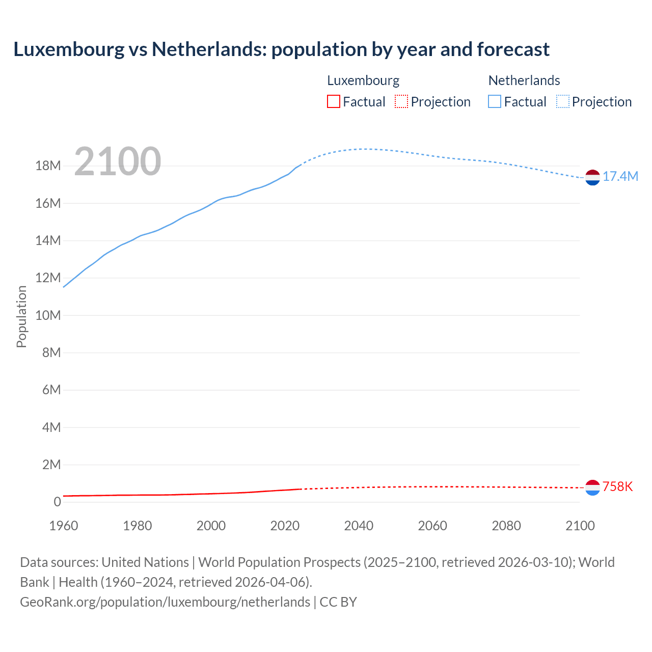 The latest officially reported population of Luxembourg was 677,012 in 2024 vs 17,993,485 people in the Netherlands in 2024. In 2026, based on the adjusted UN estimation, the current Luxembourg's population is 693,885 people compared to 18,252,623 in the Netherlands.