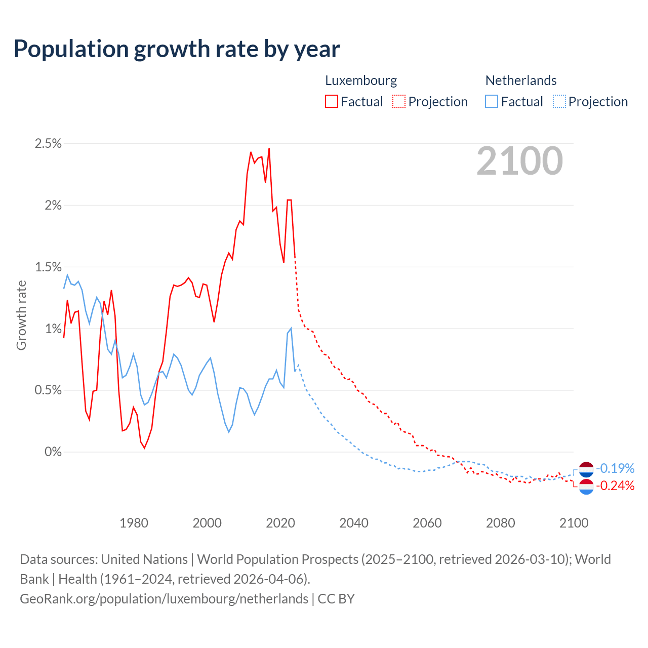 - For the last 10 years, Luxembourg has had an average growth rate of +2.02% per year vs +0.62% in the Netherlands.