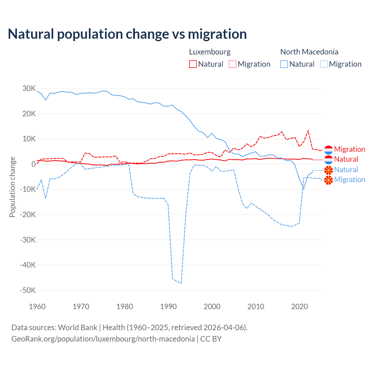 Over the last 10 years, 16.8% of the population change in Luxembourg is from natural causes (a gain of 20,287 people) and 83.2% is from migration (a gain of 100,435 people). In North Macedonia 6.45% is from natural causes (a loss of 12,585 people) and 93.5% is from migration (a loss of 182,429 people).