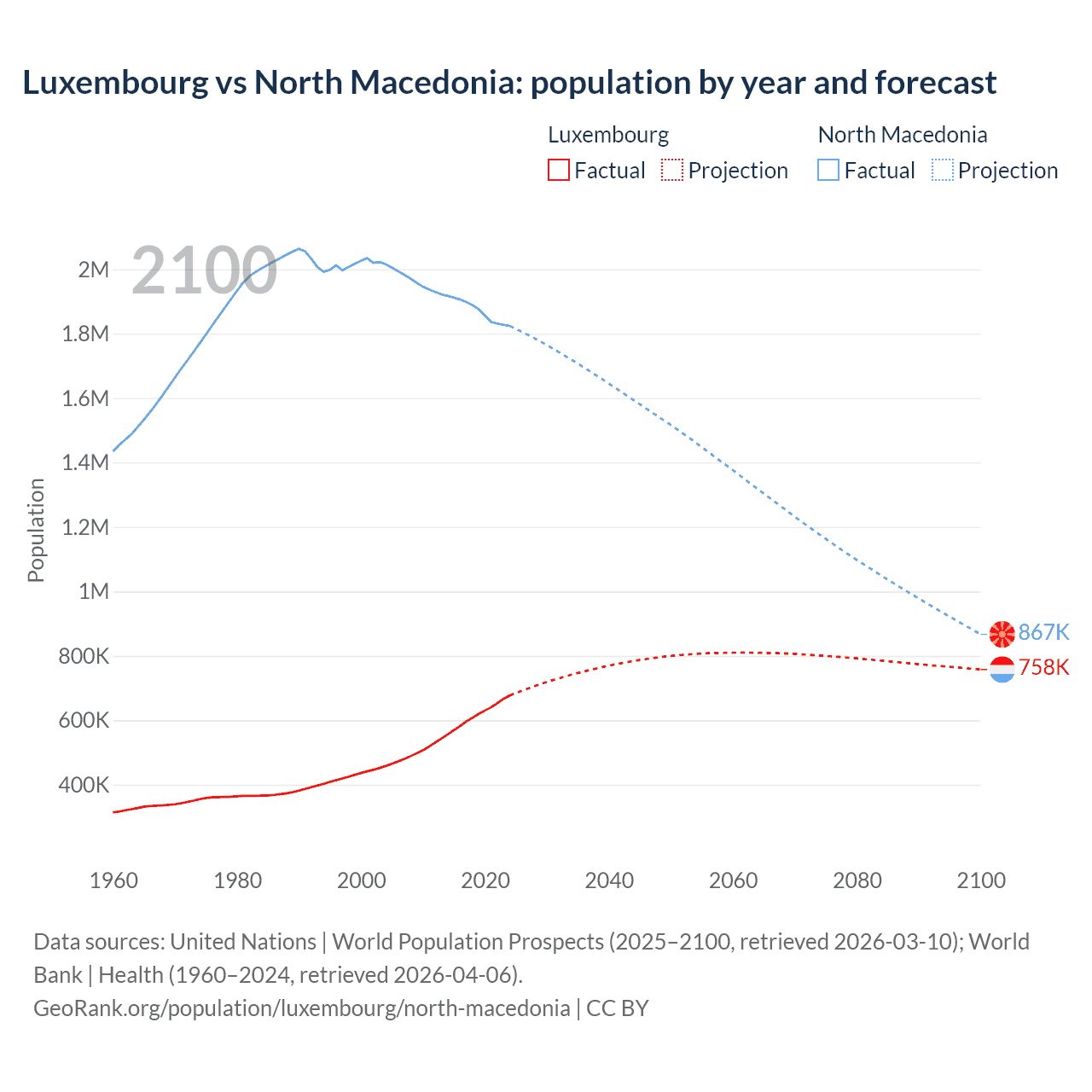 The latest officially reported population of Luxembourg was 677,012 in 2024 vs 1,824,359 people in North Macedonia in 2024. In 2026, based on the adjusted UN estimation, the current Luxembourg's population is 693,885 people compared to 1,805,954 in North Macedonia.