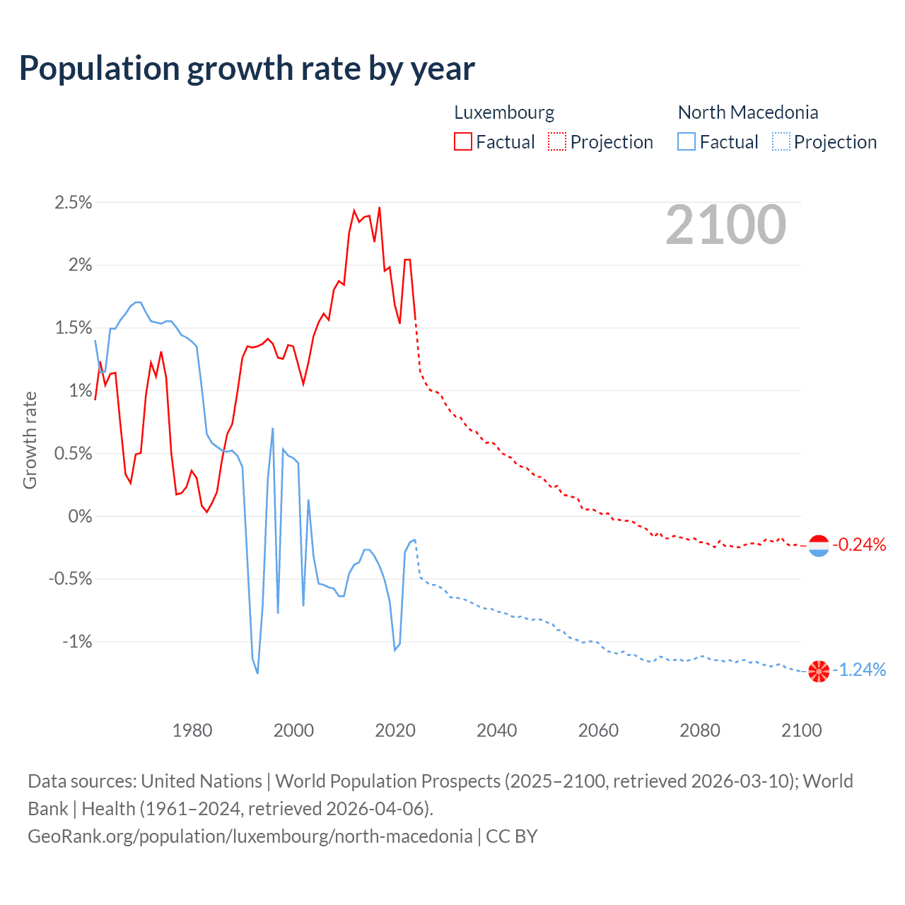 - For the last 10 years, Luxembourg has had an average growth rate of +2.02% per year vs -0.48% in North Macedonia.