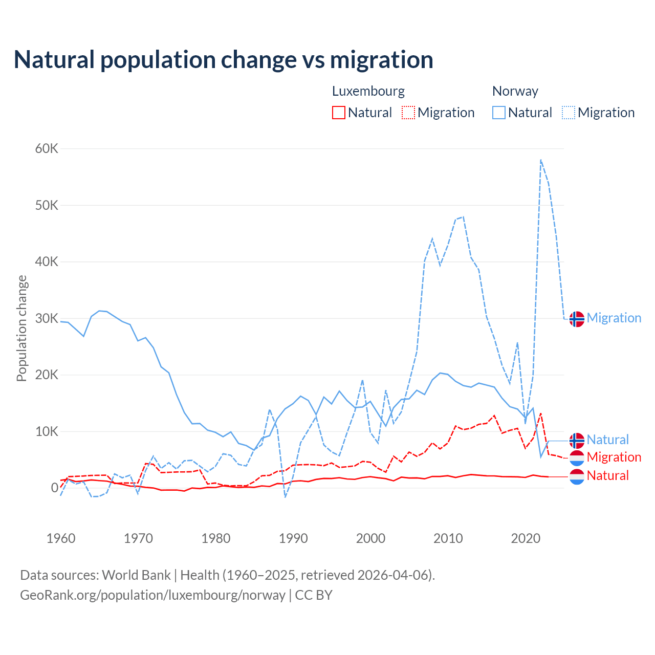 Over the last 10 years, 16.8% of the population change in Luxembourg is from natural causes (a gain of 20,287 people) and 83.2% is from migration (a gain of 100,435 people). In Norway 31.3% is from natural causes (a gain of 138,699 people) and 68.7% is from migration (a gain of 303,945 people).