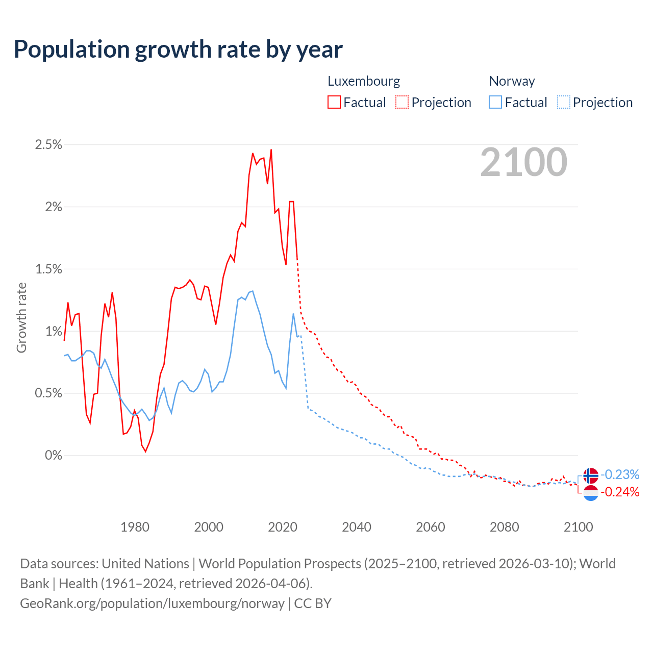- For the last 10 years, Luxembourg has had an average growth rate of +2.02% per year vs +0.85% in Norway.