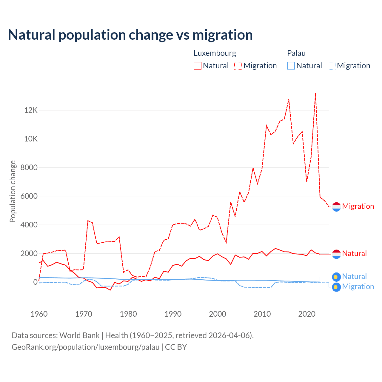 Over the last 10 years, 16.8% of the population change in Luxembourg is from natural causes (a gain of 20,287 people) and 83.2% is from migration (a gain of 100,435 people). In Palau 53.8% is from natural causes (a gain of 264 people) and 46.2% is from migration (a loss of 227 people).