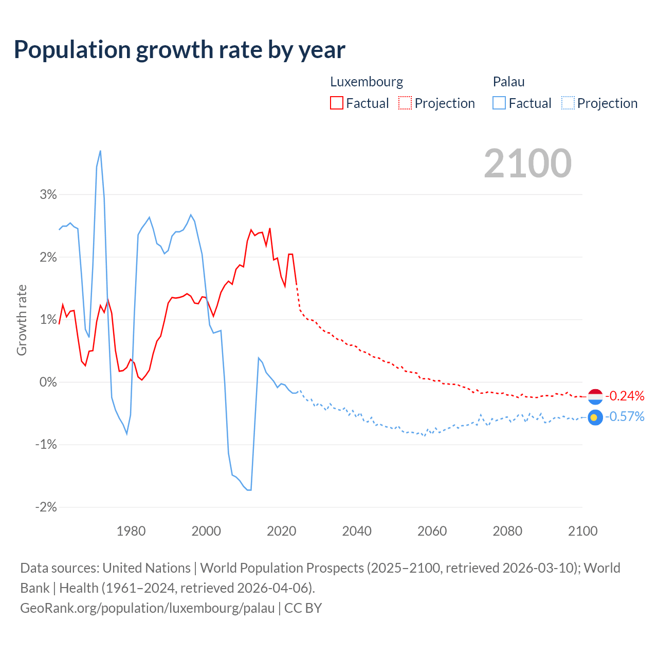 - For the last 10 years, Luxembourg has had an average growth rate of +2.02% per year vs +0.02% in Palau.
