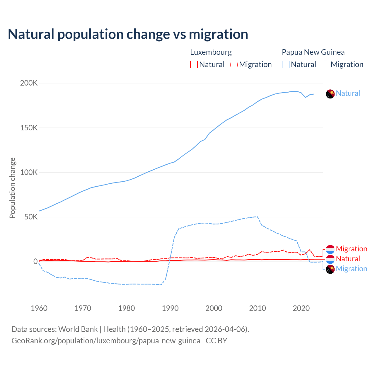 Over the last 10 years, 16.8% of the population change in Luxembourg is from natural causes (a gain of 20,287 people) and 83.2% is from migration (a gain of 100,435 people). In Papua New Guinea 91% is from natural causes (a gain of 1,883,906 people) and 8.98% is from migration (a gain of 185,900 people).