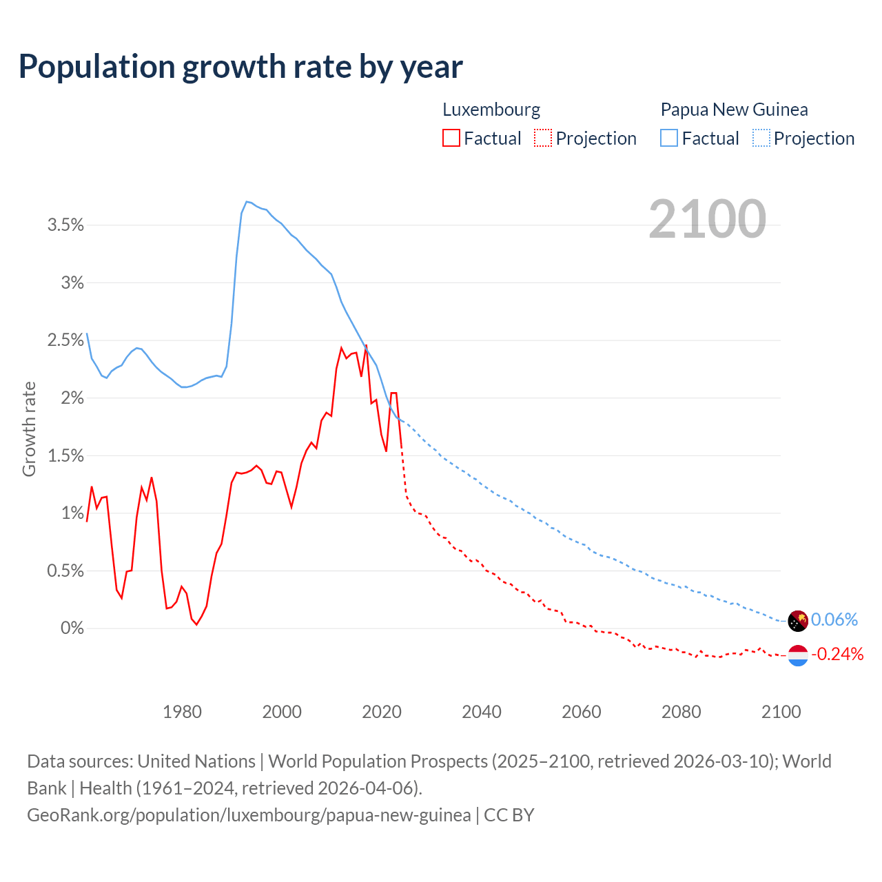 - For the last 10 years, Luxembourg has had an average growth rate of +2.02% per year vs +2.23% in Papua New Guinea.