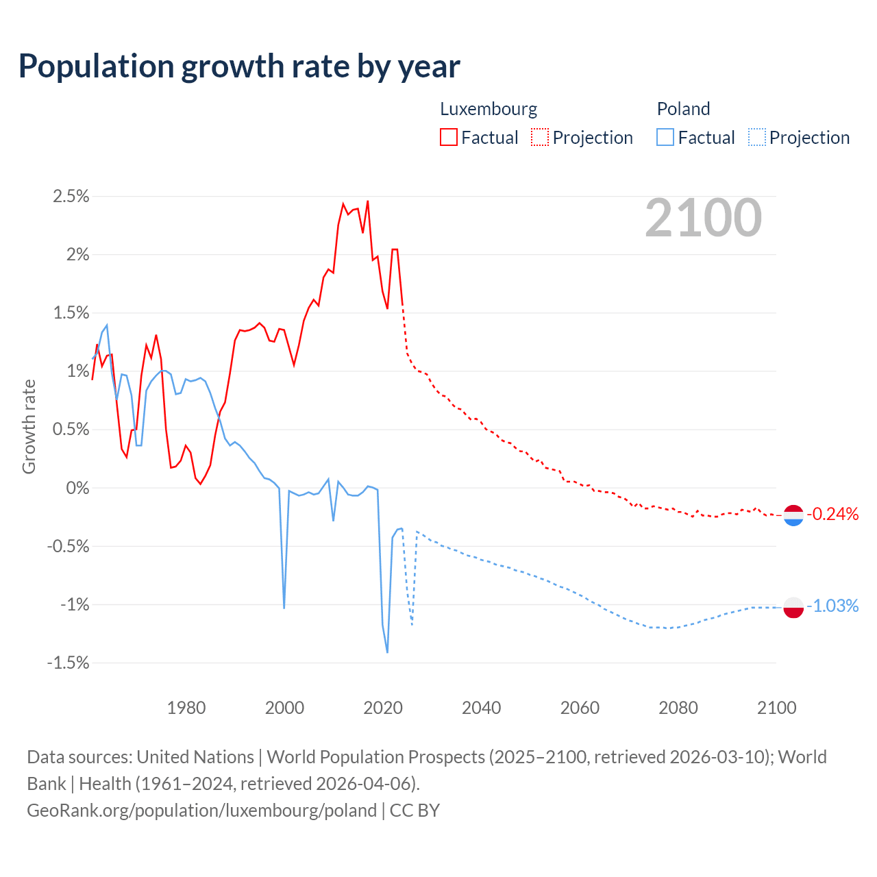 - For the last 10 years, Luxembourg has had an average growth rate of +2.02% per year vs -0.36% in Poland.