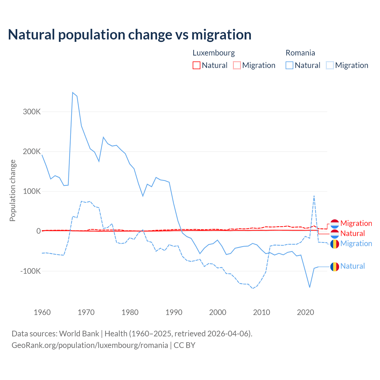 Over the last 10 years, 16.8% of the population change in Luxembourg is from natural causes (a gain of 20,287 people) and 83.2% is from migration (a gain of 100,435 people). In Romania 82% is from natural causes (a loss of 766,295 people) and 18% is from migration (a loss of 167,917 people).