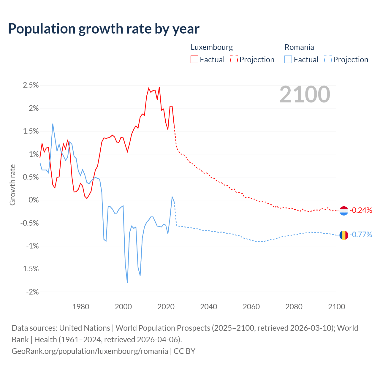 - For the last 10 years, Luxembourg has had an average growth rate of +2.02% per year vs -0.43% in Romania.