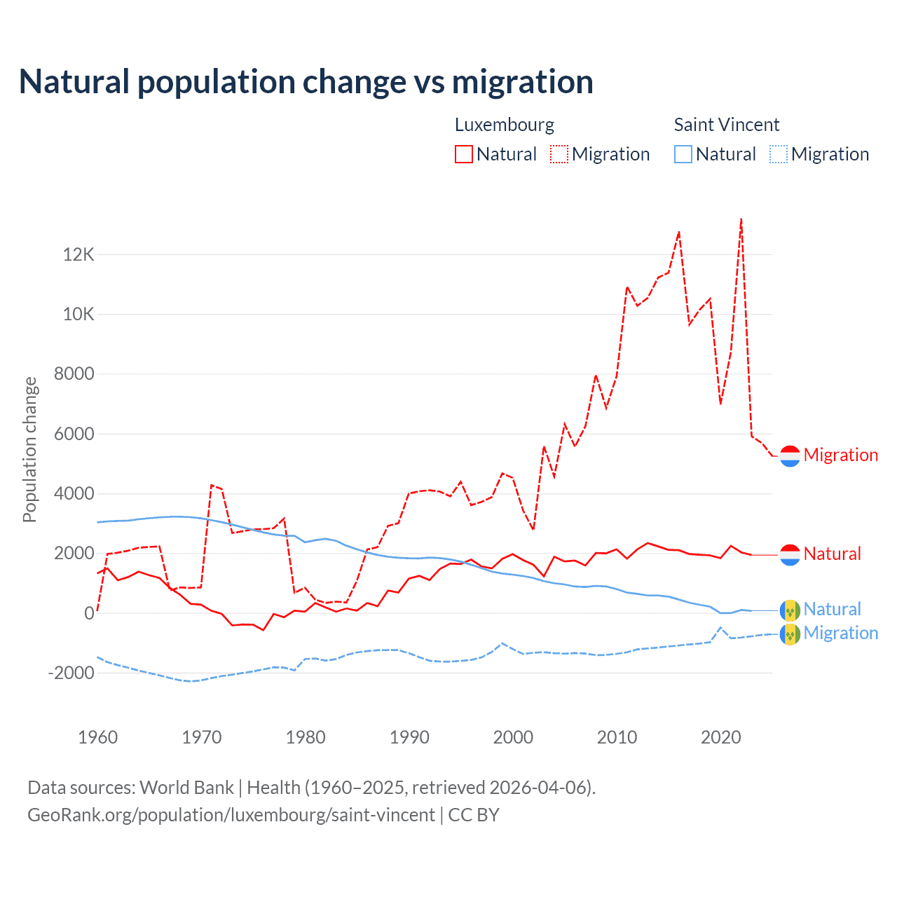 Over the last 10 years, 16.8% of the population change in Luxembourg is from natural causes (a gain of 20,287 people) and 83.2% is from migration (a gain of 100,435 people). In Saint Vincent 21.2% is from natural causes (a gain of 2,525 people) and 78.8% is from migration (a loss of 9,393 people).