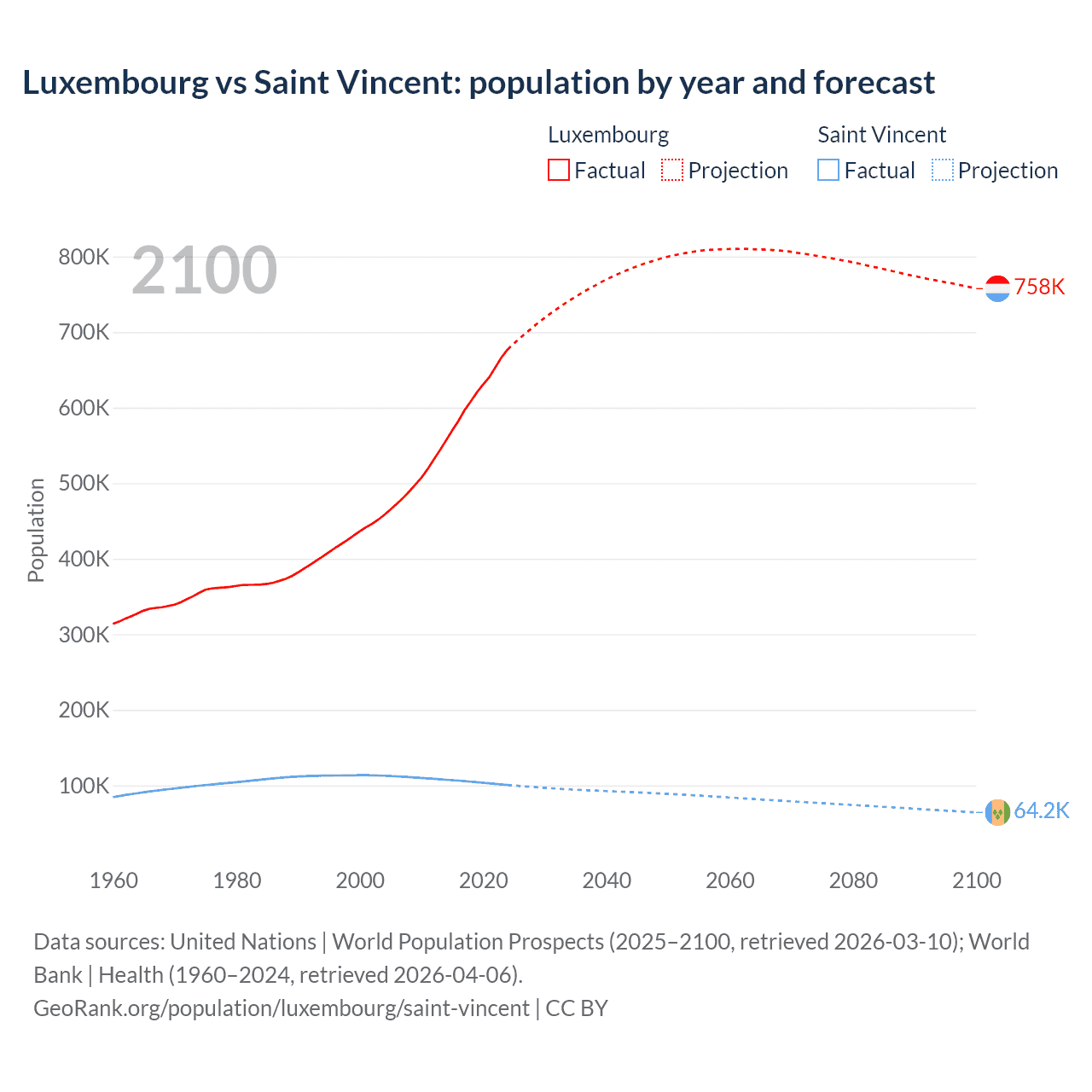 The latest officially reported population of Luxembourg was 677,012 in 2024 vs 100,616 people in Saint Vincent in 2024. In 2026, based on the adjusted UN estimation, the current Luxembourg's population is 693,885 people compared to 99,237 in Saint Vincent.