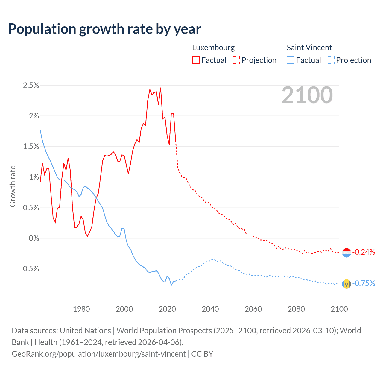 - For the last 10 years, Luxembourg has had an average growth rate of +2.02% per year vs -0.65% in Saint Vincent.