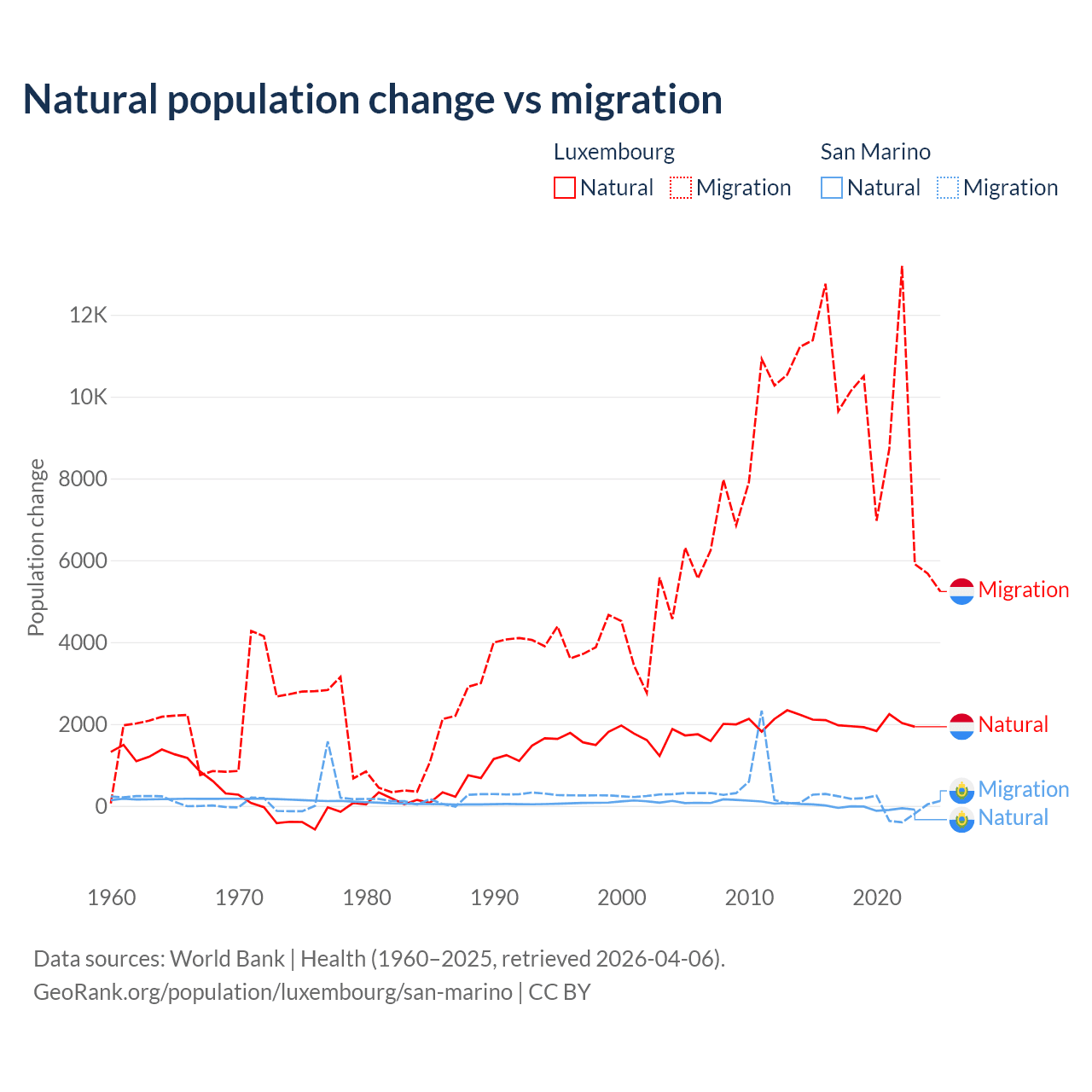 Over the last 10 years, 16.8% of the population change in Luxembourg is from natural causes (a gain of 20,287 people) and 83.2% is from migration (a gain of 100,435 people). In San Marino 40.9% is from natural causes (a loss of 358 people) and 59.1% is from migration (a gain of 517 people).