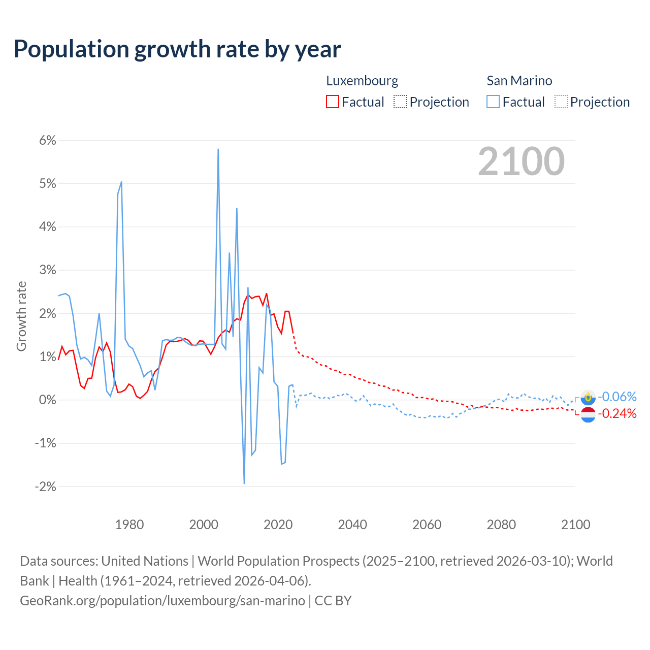 - For the last 10 years, Luxembourg has had an average growth rate of +2.02% per year vs +0.26% in San Marino.