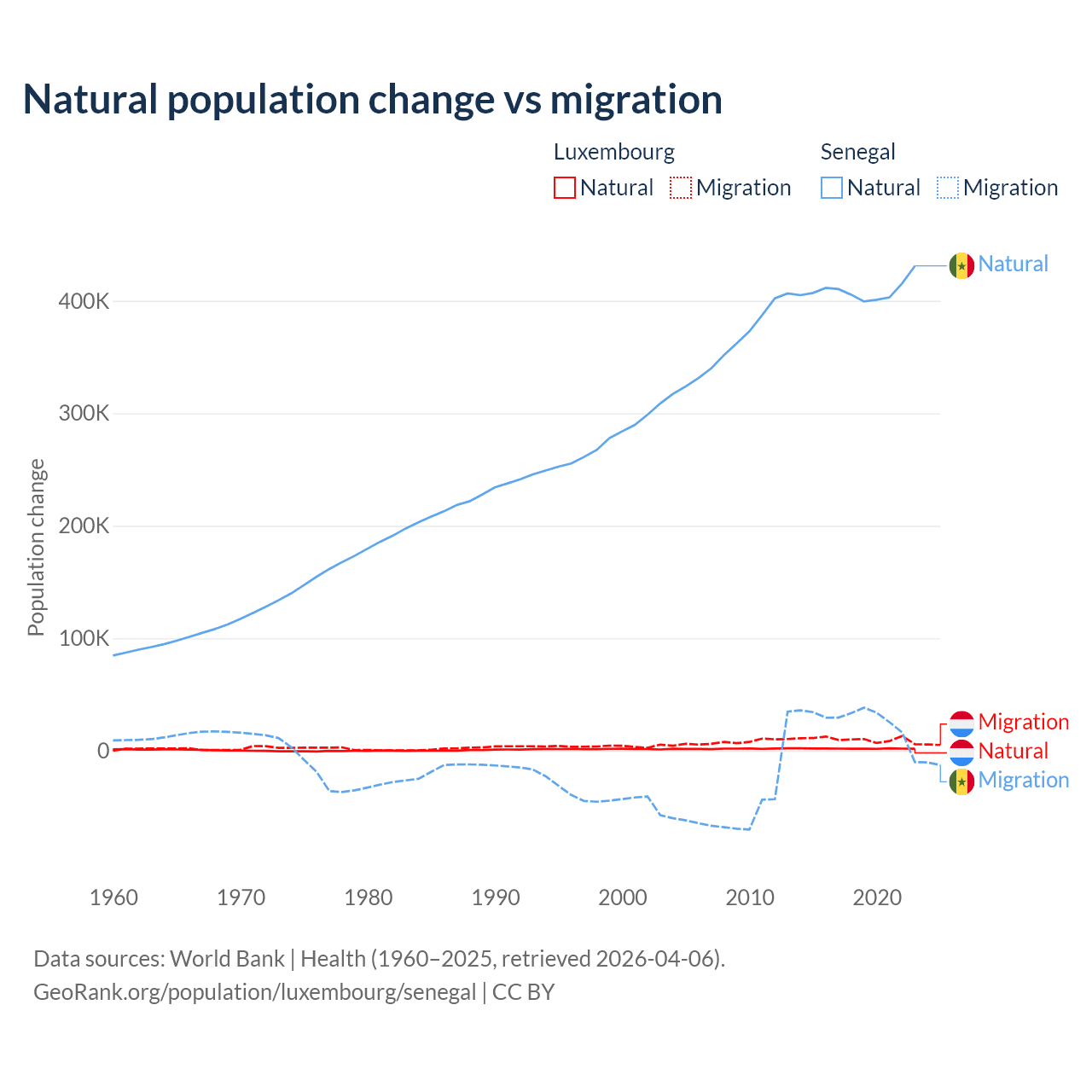 Over the last 10 years, 16.8% of the population change in Luxembourg is from natural causes (a gain of 20,287 people) and 83.2% is from migration (a gain of 100,435 people). In Senegal 93.9% is from natural causes (a gain of 4,089,205 people) and 6.13% is from migration (a gain of 267,266 people).