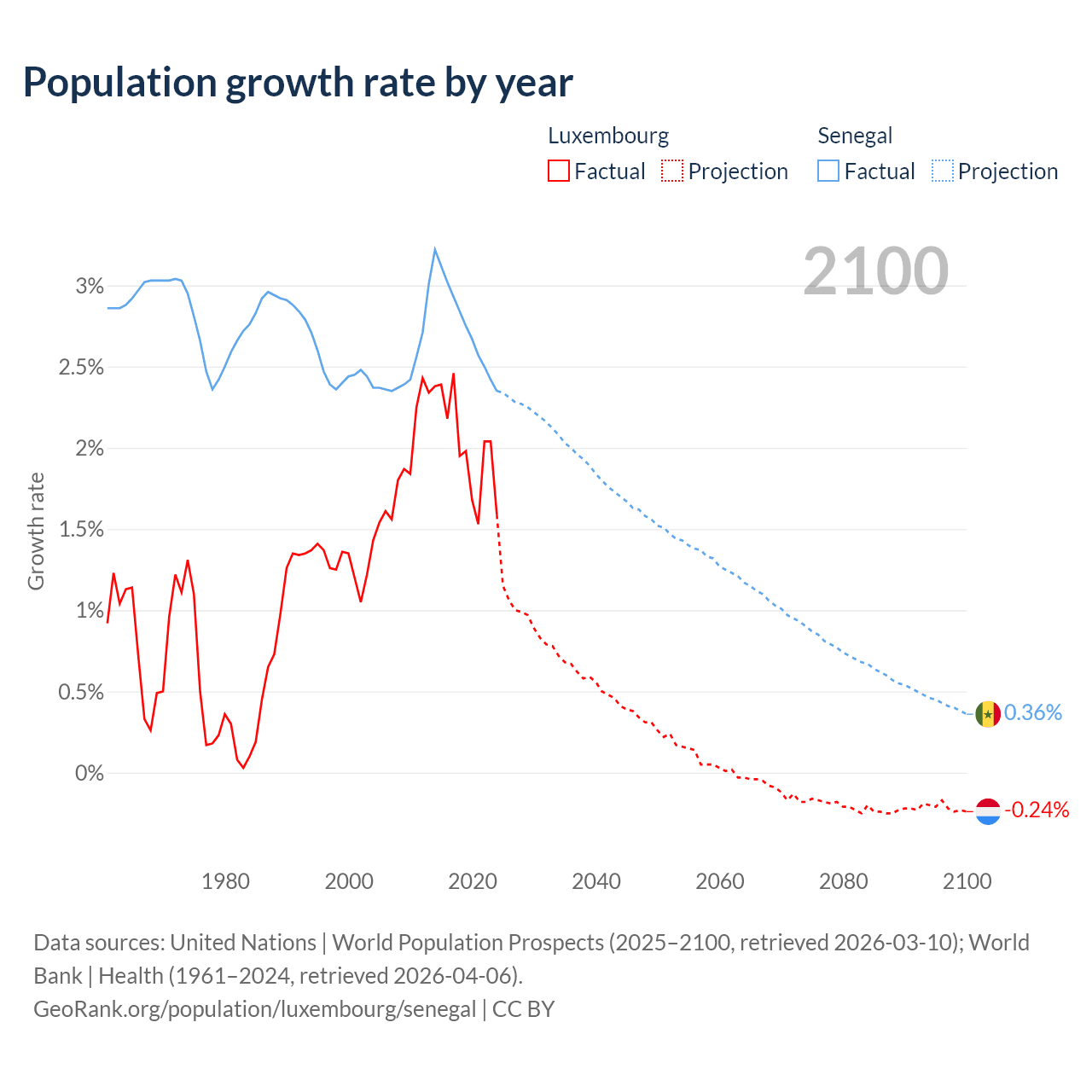 - For the last 10 years, Luxembourg has had an average growth rate of +2.02% per year vs +2.76% in Senegal.