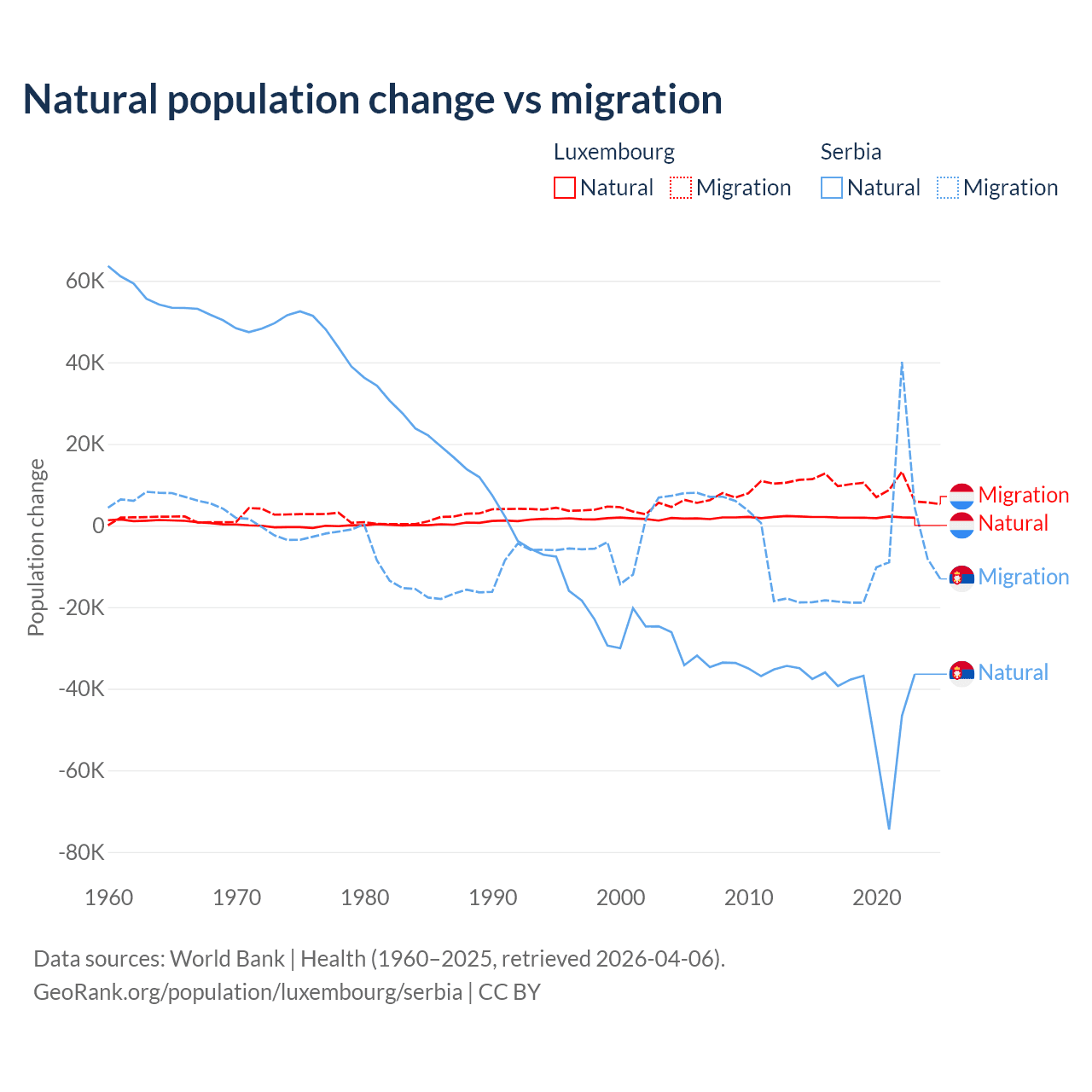 Over the last 10 years, 16.8% of the population change in Luxembourg is from natural causes (a gain of 20,287 people) and 83.2% is from migration (a gain of 100,435 people). In Serbia 83.3% is from natural causes (a loss of 435,148 people) and 16.7% is from migration (a loss of 87,110 people).