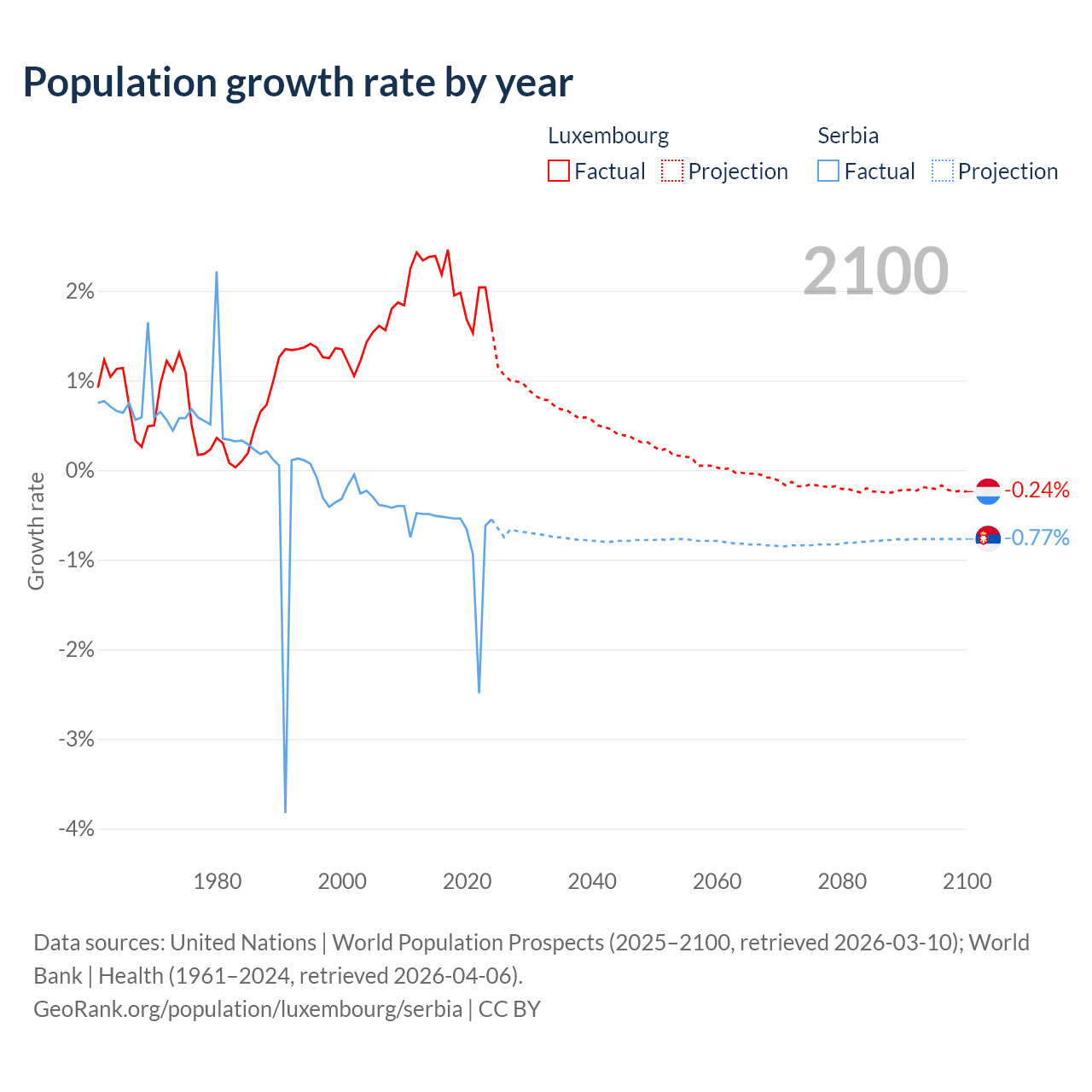 - For the last 10 years, Luxembourg has had an average growth rate of +2.02% per year vs -0.76% in Serbia.