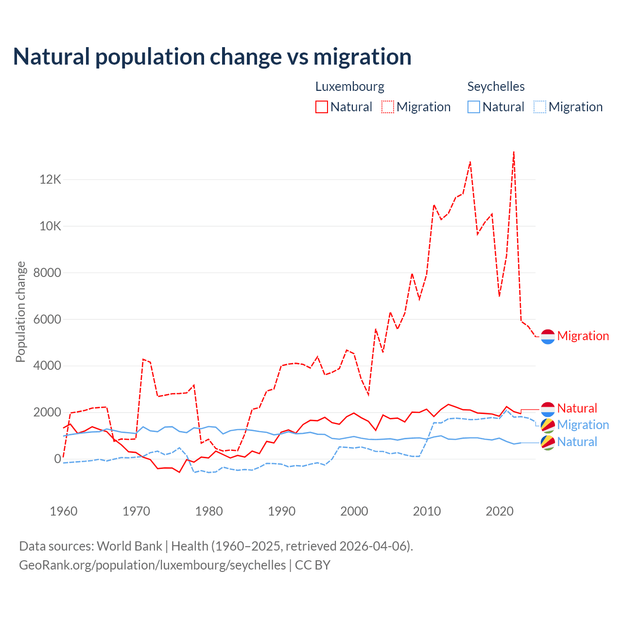 Over the last 10 years, 16.8% of the population change in Luxembourg is from natural causes (a gain of 20,287 people) and 83.2% is from migration (a gain of 100,435 people). In the Seychelles 31.4% is from natural causes (a gain of 8,122 people) and 68.6% is from migration (a gain of 17,748 people).
