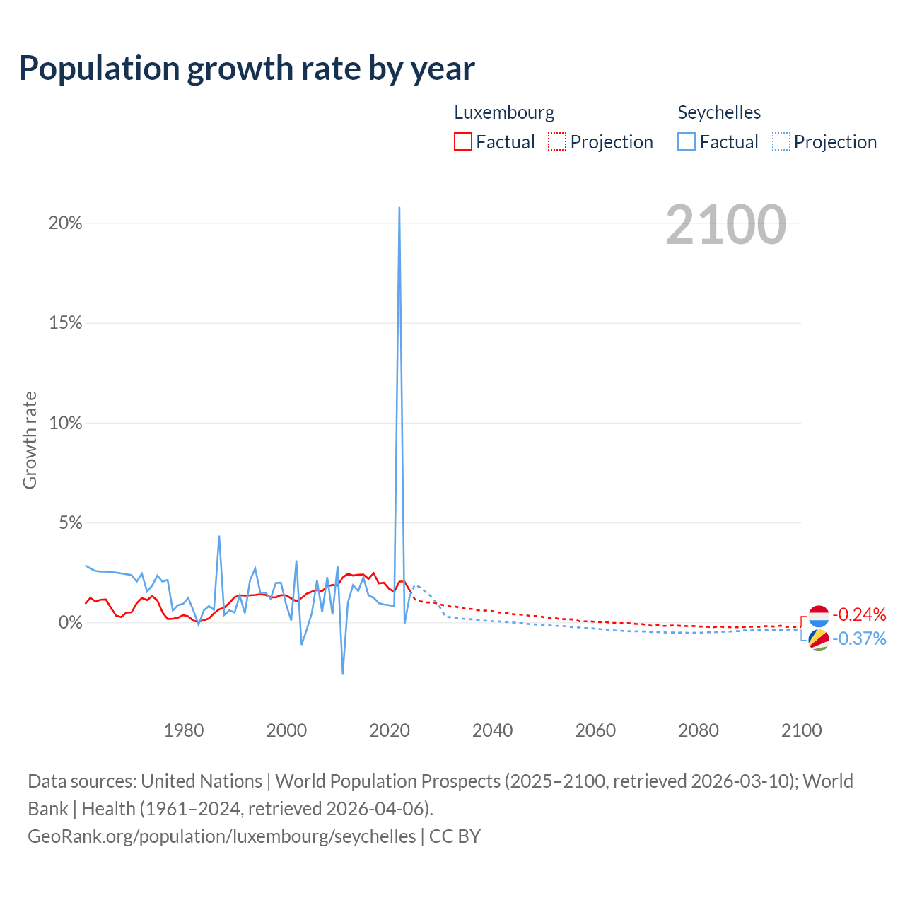 - For the last 10 years, Luxembourg has had an average growth rate of +2.02% per year vs +2.9% in the Seychelles.