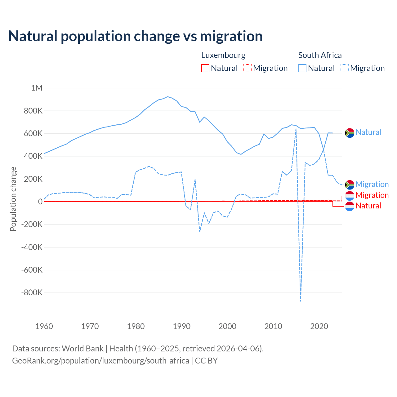 Over the last 10 years, 16.8% of the population change in Luxembourg is from natural causes (a gain of 20,287 people) and 83.2% is from migration (a gain of 100,435 people). In South Africa 72.8% is from natural causes (a gain of 6,190,027 people) and 27.2% is from migration (a gain of 2,316,795 people).
