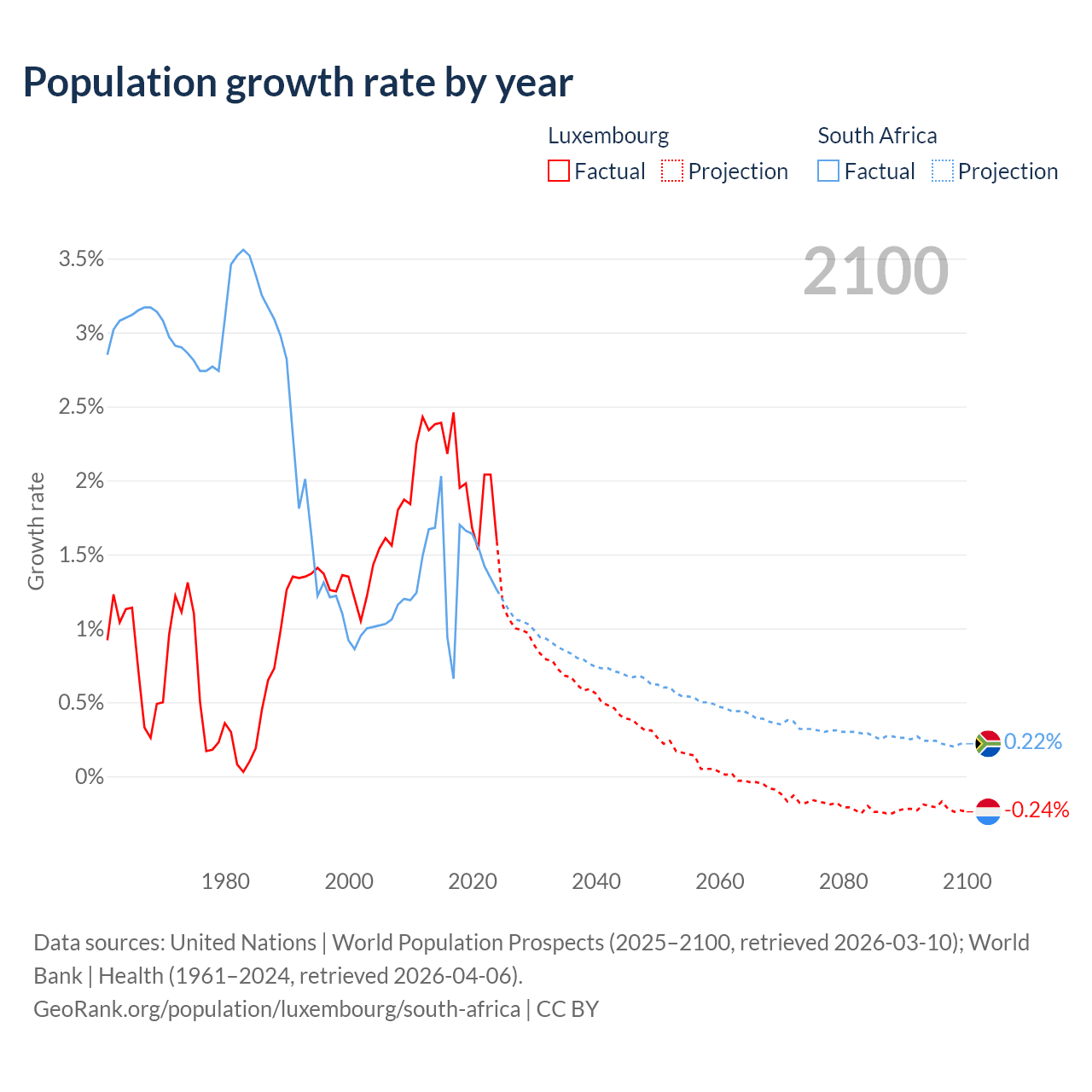 - For the last 10 years, Luxembourg has had an average growth rate of +2.02% per year vs +1.44% in South Africa.