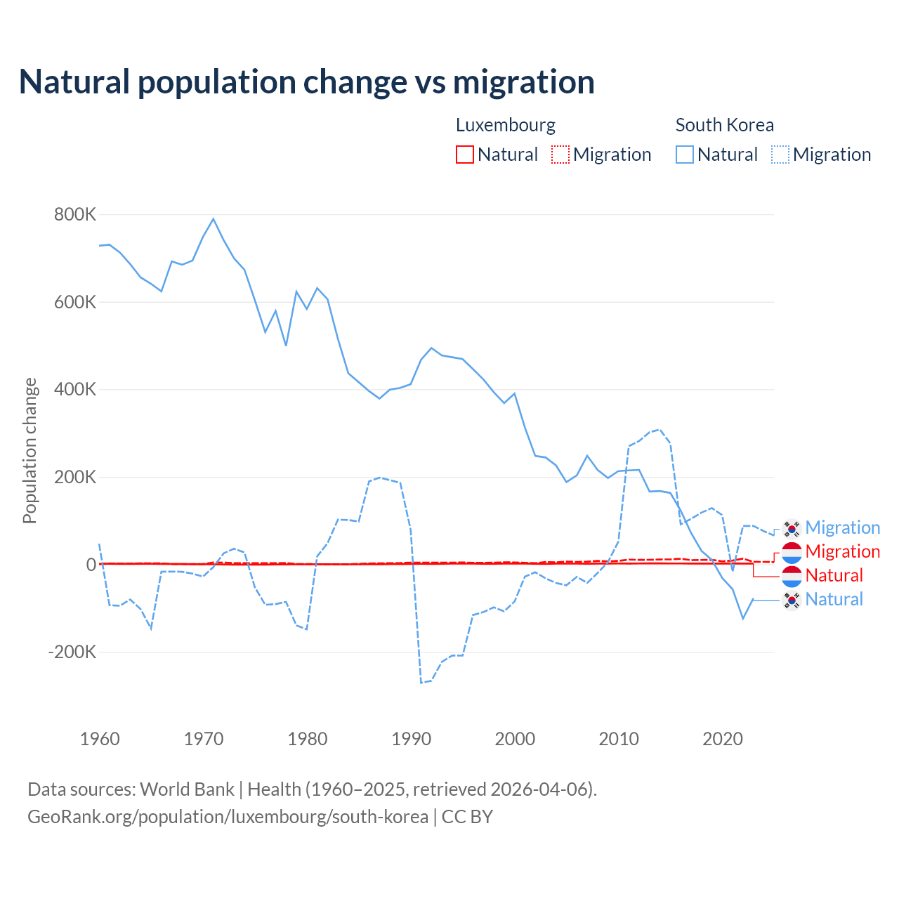 Over the last 10 years, 16.8% of the population change in Luxembourg is from natural causes (a gain of 20,287 people) and 83.2% is from migration (a gain of 100,435 people). In South Korea 17.6% is from natural causes (a gain of 277,215 people) and 82.4% is from migration (a gain of 1,298,356 people).
