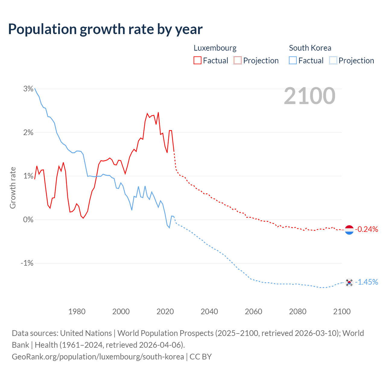 - For the last 10 years, Luxembourg has had an average growth rate of +2.02% per year vs +0.24% in South Korea.