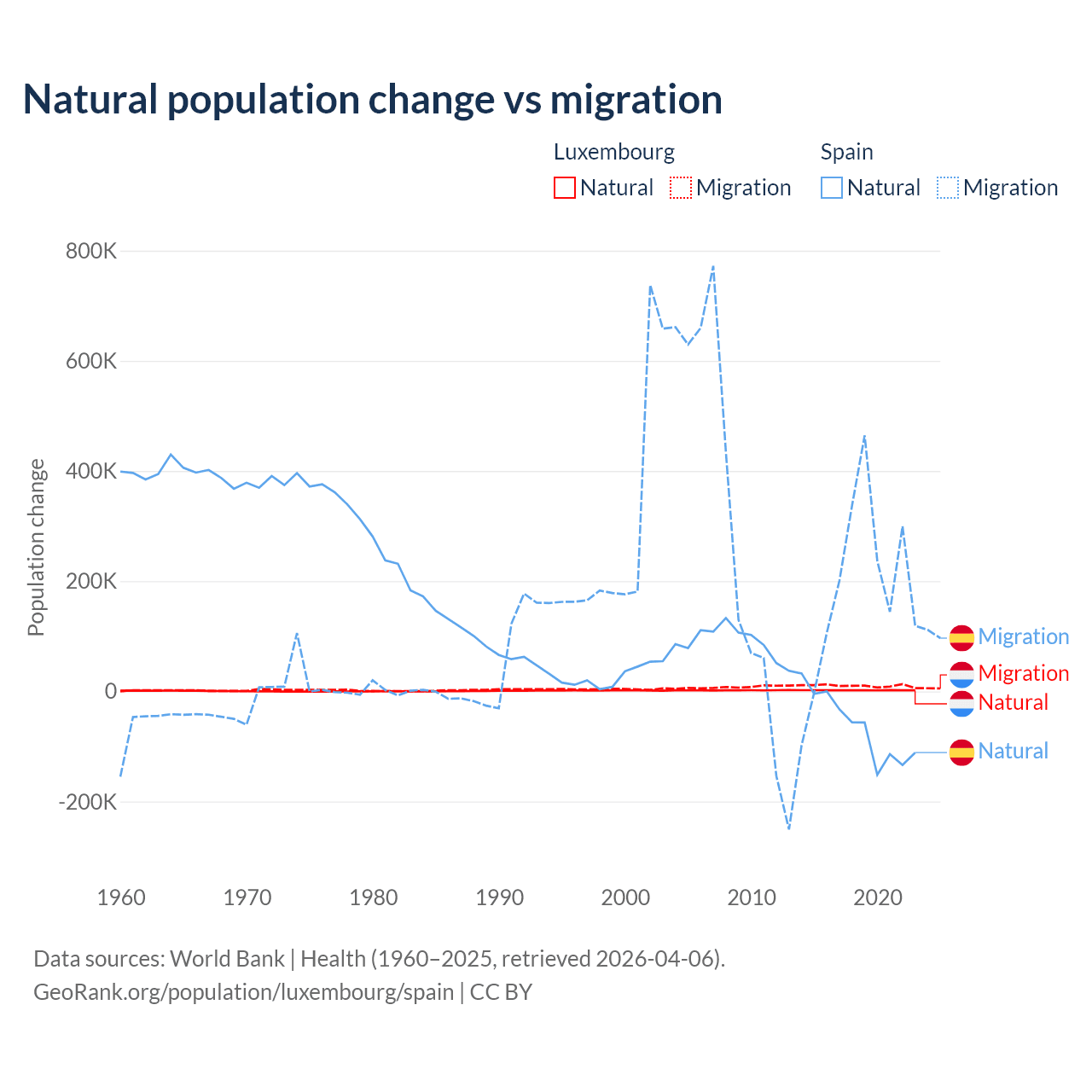 Over the last 10 years, 16.8% of the population change in Luxembourg is from natural causes (a gain of 20,287 people) and 83.2% is from migration (a gain of 100,435 people). In Spain 25.8% is from natural causes (a loss of 627,829 people) and 74.2% is from migration (a gain of 1,810,127 people).