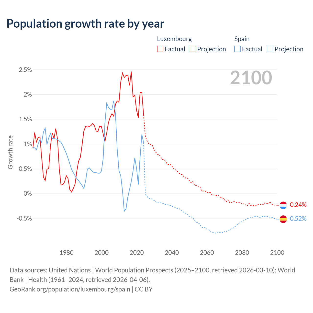 - For the last 10 years, Luxembourg has had an average growth rate of +2.02% per year vs +0.43% in Spain.