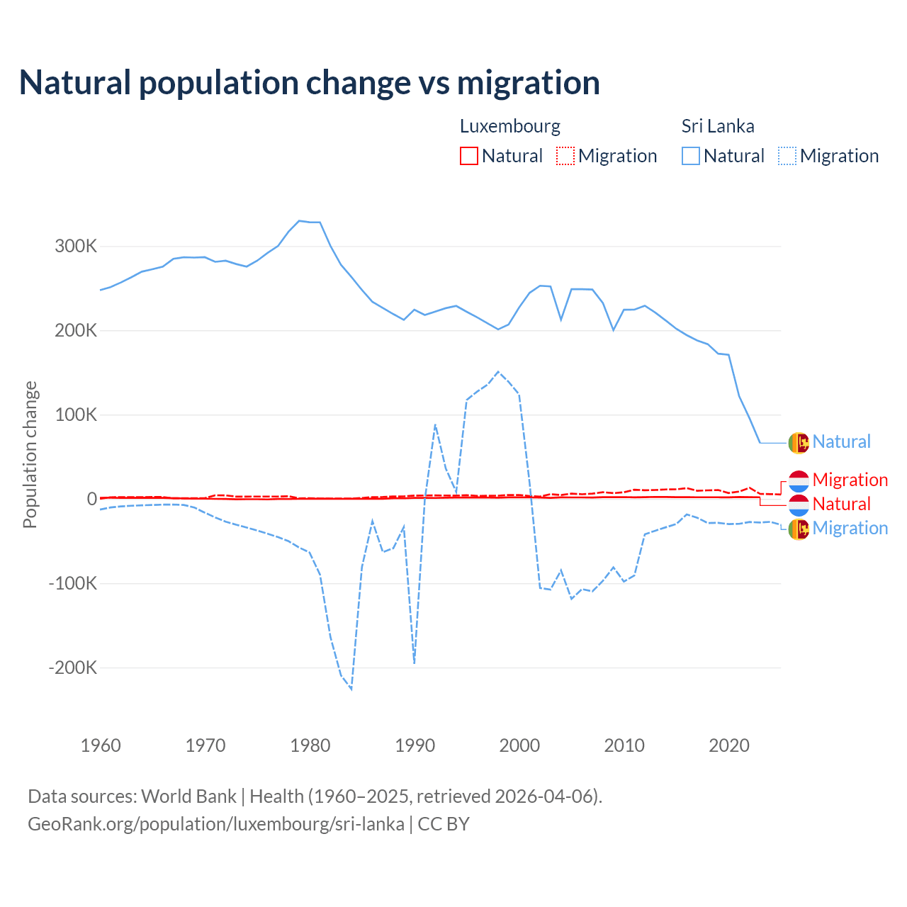 Over the last 10 years, 16.8% of the population change in Luxembourg is from natural causes (a gain of 20,287 people) and 83.2% is from migration (a gain of 100,435 people). In Sri Lanka 85.3% is from natural causes (a gain of 1,605,749 people) and 14.7% is from migration (a loss of 276,121 people).